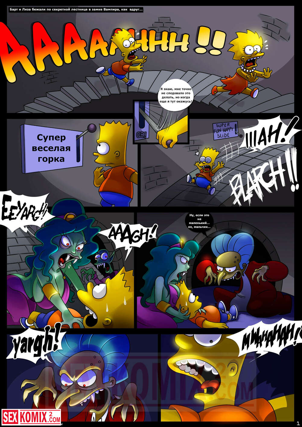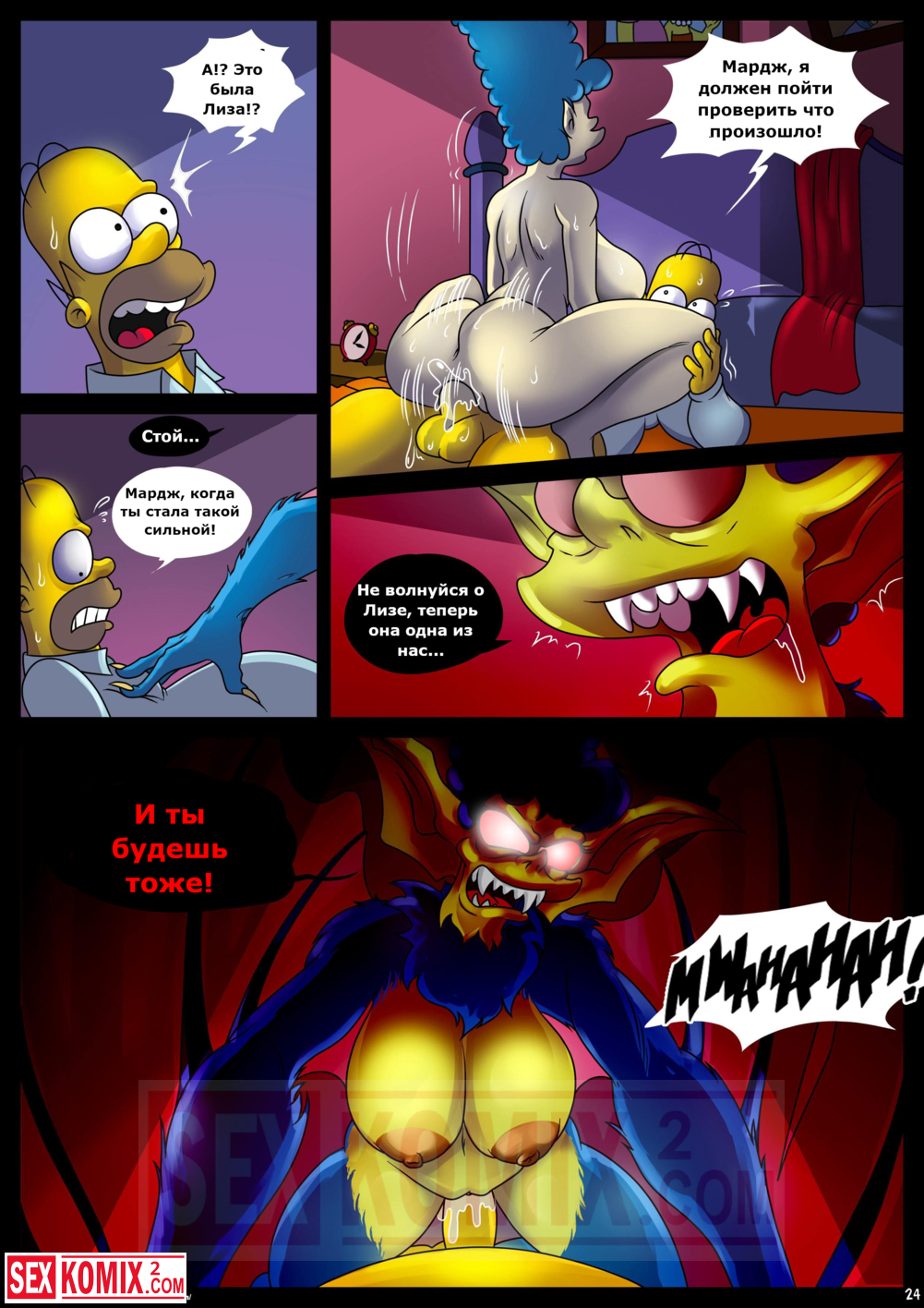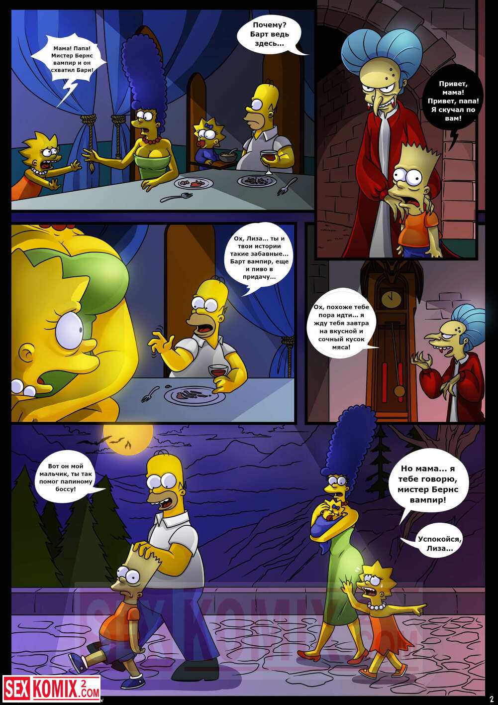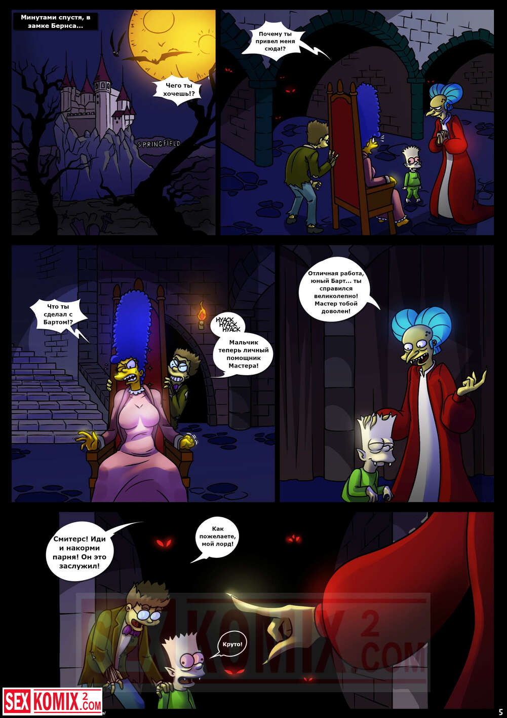 Порно комикс Симпсоны. Домик на дереве ужасов. Часть 4. Kogeikun. Семья Симпсонов попала в старый замок, где обитает древний вампир. Он кусает Мардж и трахает её, пока Гомер спит.