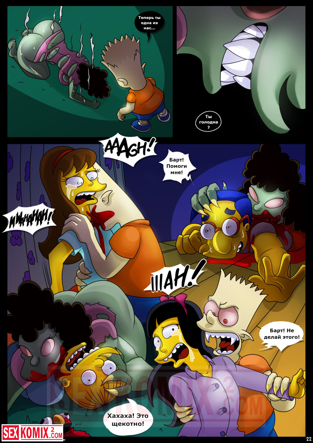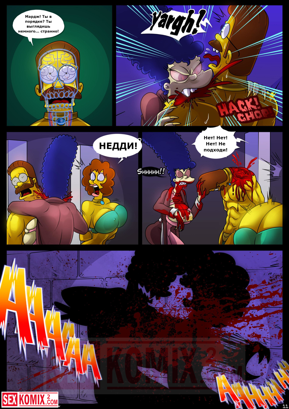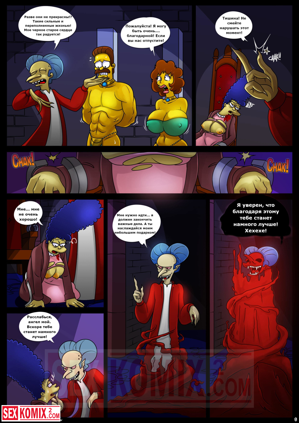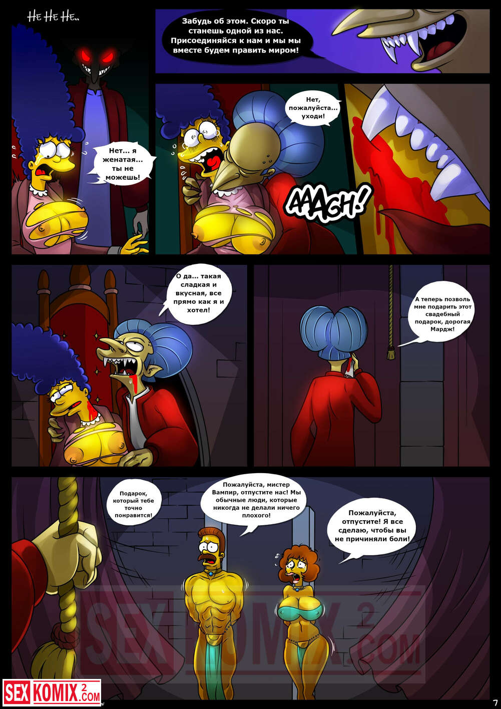 Порно комикс Симпсоны. Домик на дереве ужасов. Часть 4. Kogeikun. Семья Симпсонов попала в старый замок, где обитает древний вампир. Он кусает Мардж и трахает её, пока Гомер спит.