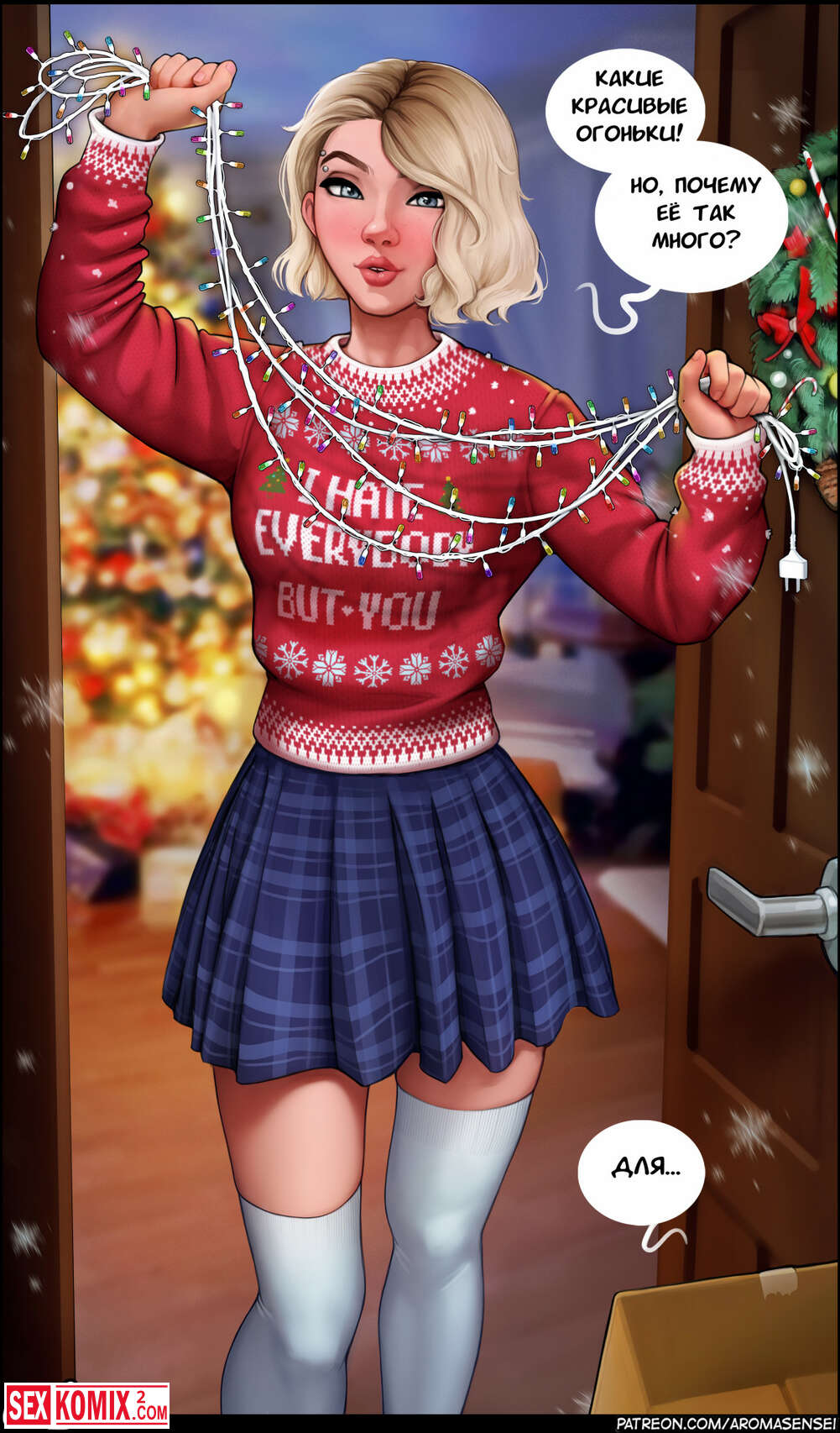 Порно комикс Гвен Стейси. Gwen. Парень пришел в гости к аппетитной блондинке и принес гирлянду. Девушка была польщена его вниманием и позволила себя выебать.