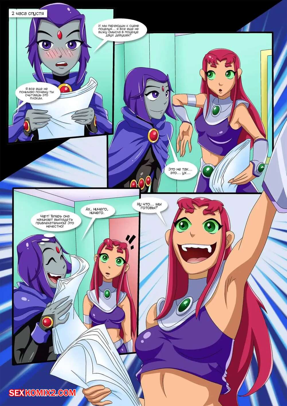 Порно комикс Teen Titans. Давайте попробуем сцену. Lets Try a Scene. Palсomix. Сценаристы пригласили Рейвен и Старфайр, чтобы они изучили сценарий с новой сценой. Рэйвен все внимательно прочитала и была настроена негативно, хотя ее подруге понравилась идея.