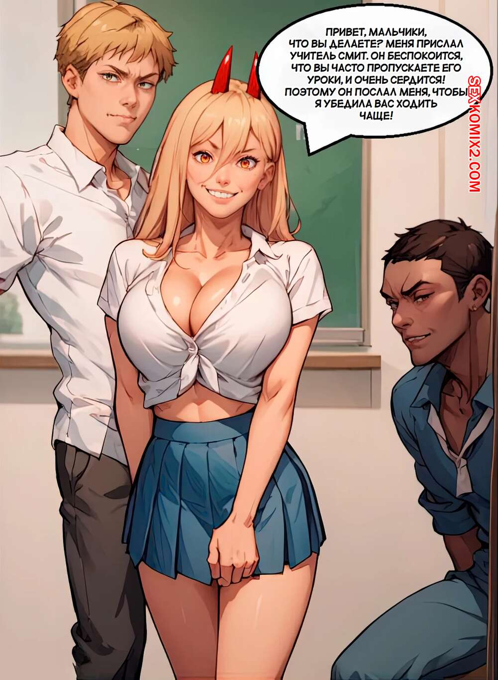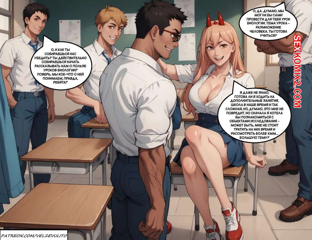 Порно комикс Chainsaw Man. Школьные приключения Пауэр. Часть 2. Velzevulito Горячая красотка Пауэр пришла в школу, где ее ждали ее одноклассники. Парни раздели девушку и дали ей отсосать свои большие хуи, после чего хорошенько ее выебали.