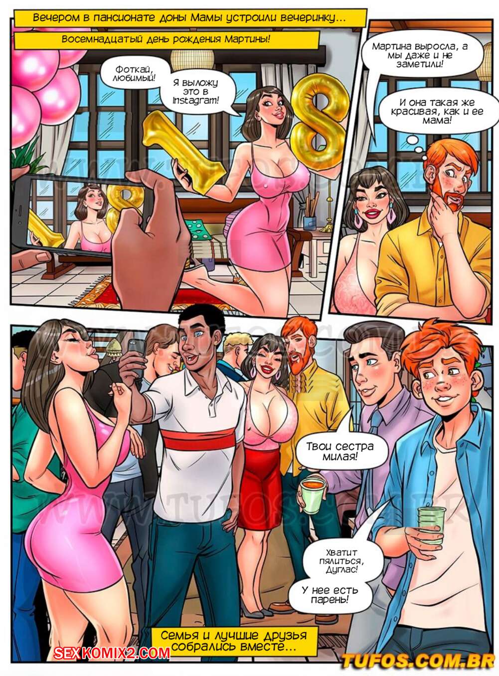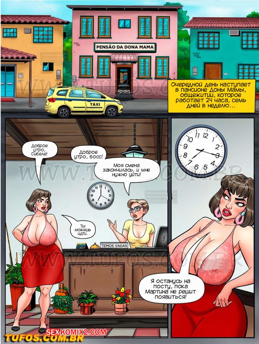 Порно комикс Донья Мама. Часть 1. Мать толпы. Dona Mama a maezona da galera. Tufos Горячая милфа владеет хостелом, в котором работает и ее дочь. Красотка пошла проводить молодого гостя в его номер, где отсосала большой хуй парня и дала ему себя выебать.