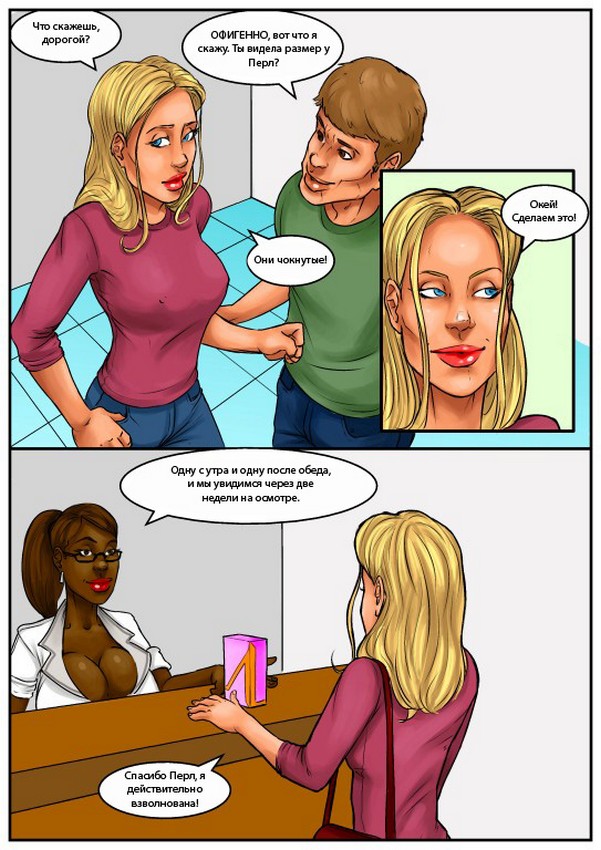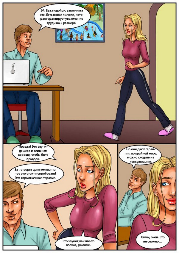 Порно комикс «Увеличение груди. Часть 1». Этот эротический комикс о молодой девушке с маленькими сиськами, она захотела их увеличить и попросила у своего мужа денег на операцию. Любящий муж не смог ей в этом отказать и она пошли в клинику. Через несколько недель когда уже всё зажило, девушка начала наслаждаться большим размером своей груди, она постоянно себя трогала и от этого возбуждалась, ей нужен был постоянный секс. Но не вовремя мужа отправили в командировку на целый месяц, и теперь озабоченной жене нужно что-то делать со своими желаниями без помощи любимого.