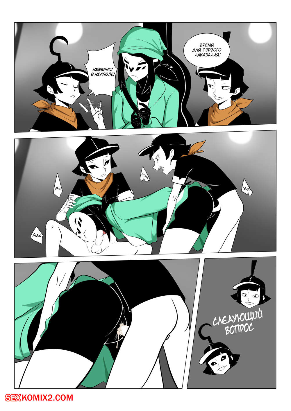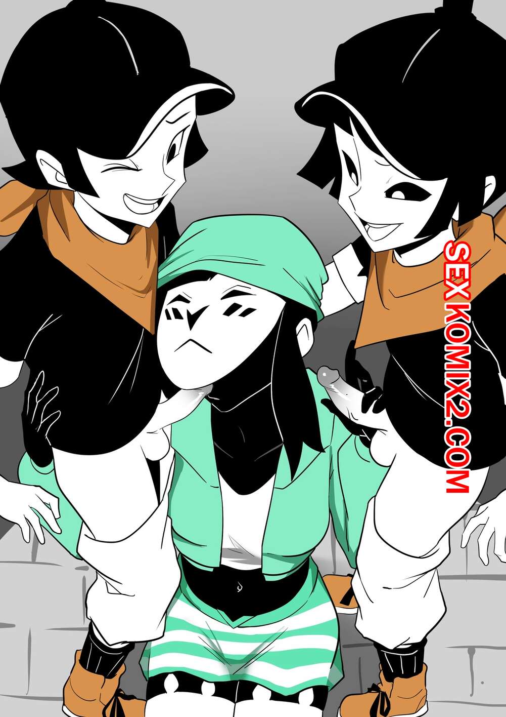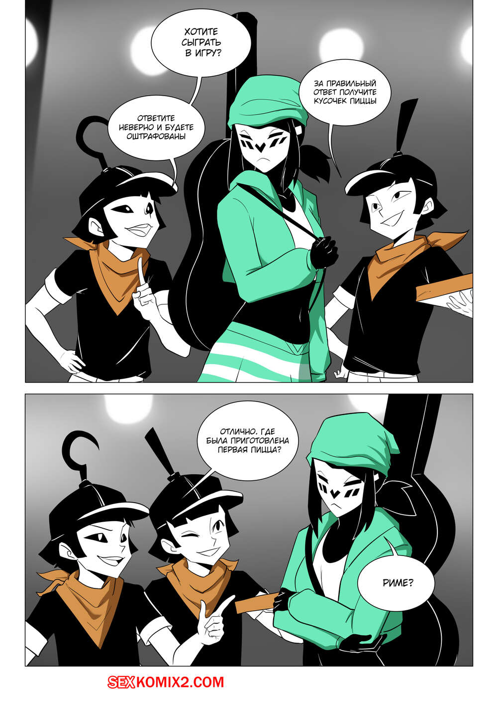 Порно комикс Mime and Dash. Правило 63. Vyzov Два парня остановили сексуальную красотку и предложили ей поучавствовать в игре. Девушке задают вопросы, а если она отвечает неправильно, то они ебут ее во все дырочки.