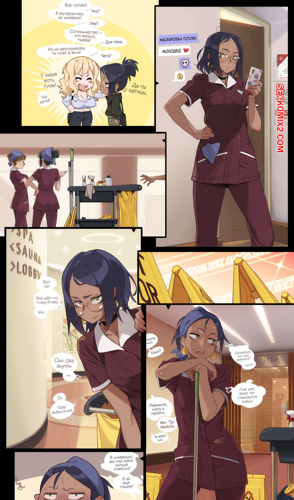 Порно комикс Клара за работой. Тактическая сауна. feguimel Горячая блондинка отдыхала в сауне и решила немного расслабиться. Девушка достала телефон и стала снимать на камеру, как она ласкает свою пизденку, получая огромное удовольствие.