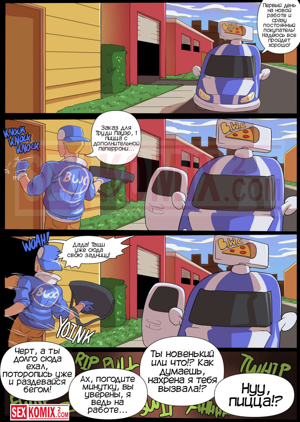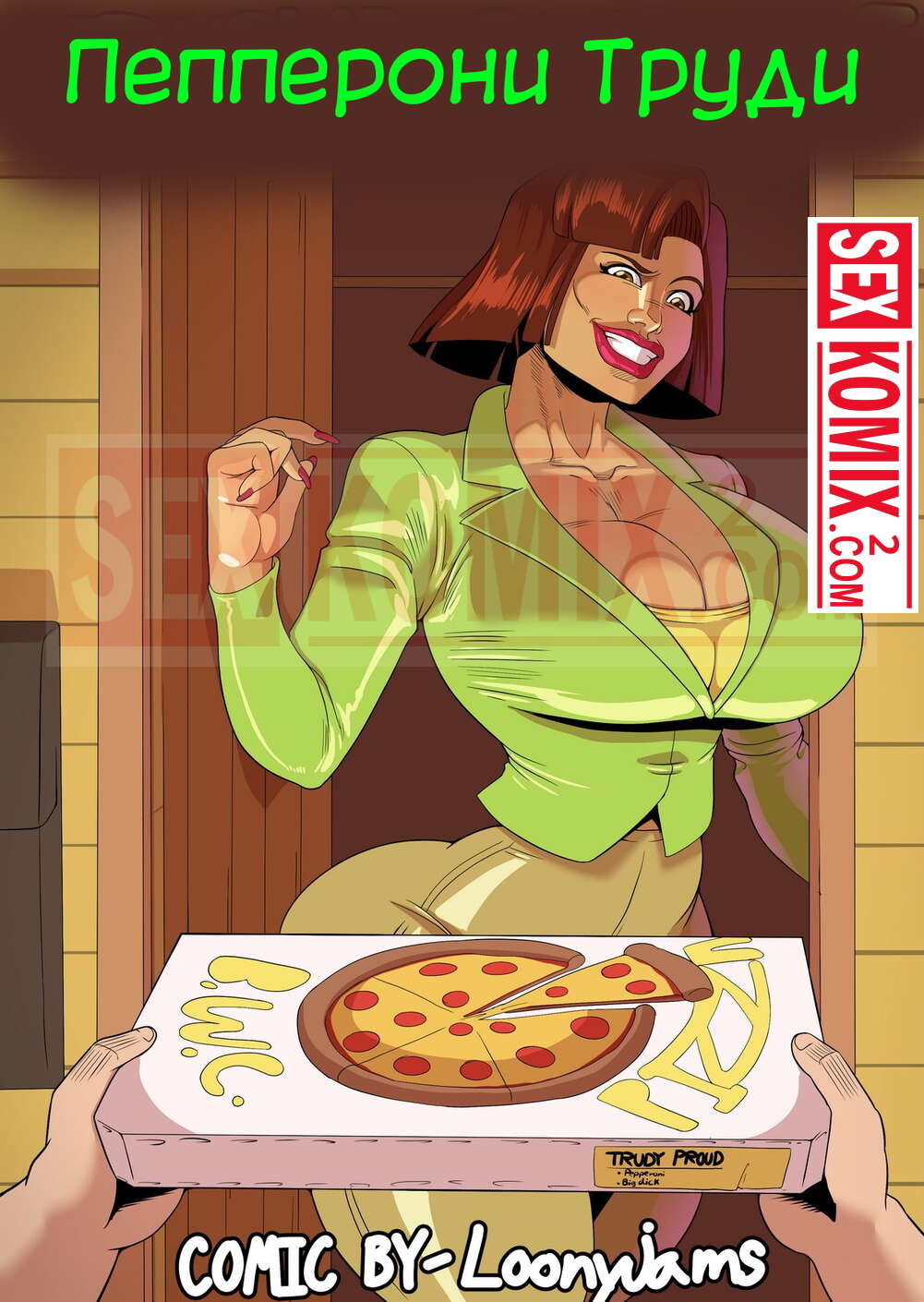 Порно комикс Пепперони Труди. Loonyjams. Женщина узнала, что муж изменил ей, как раз привезли пиццу. Не долго думая она затащила курьера в дом, сняла с него штаны и изменила своему мужу.