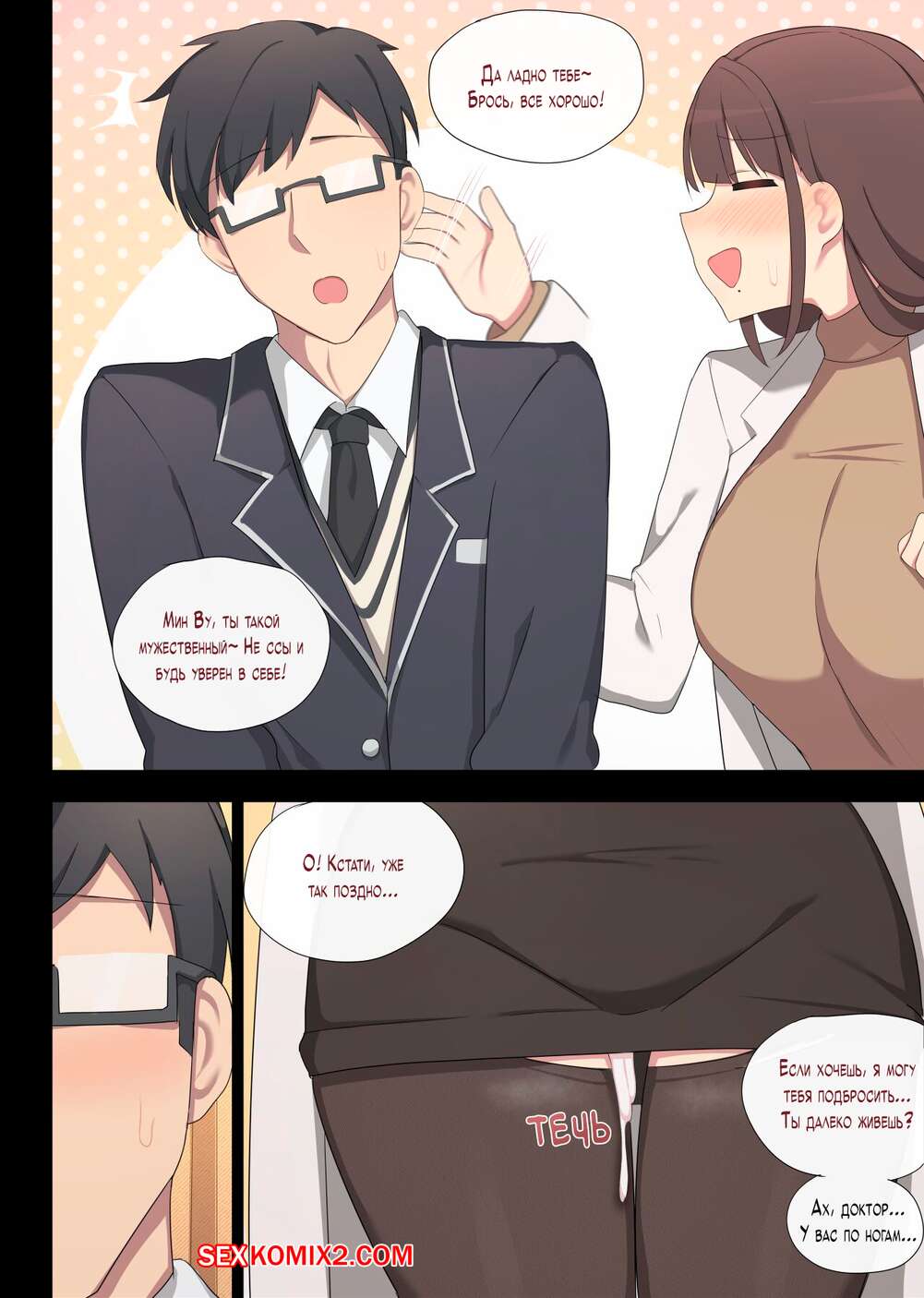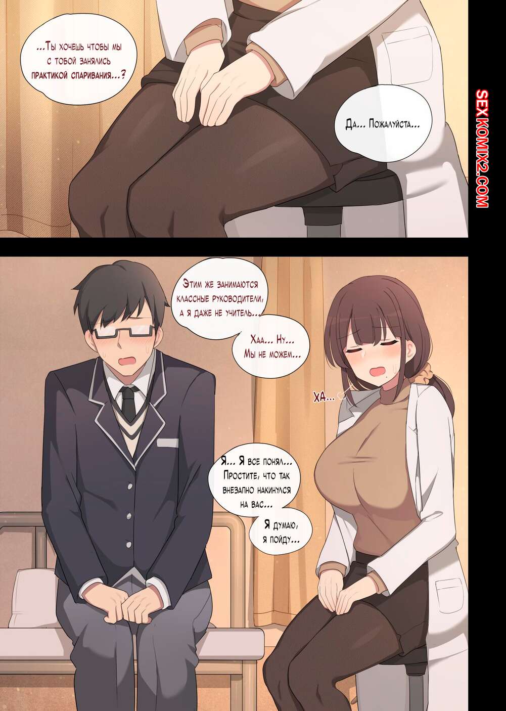 Порно комикс Практика спаривания. Часть 4. Mating Practice. Poyeop Парень пришел к медсестре, которая решила повеселиться со своим пацинтом. Девушка разделась и отсосала большой хуй парня, после чего дала ему выебать свою пизденку.