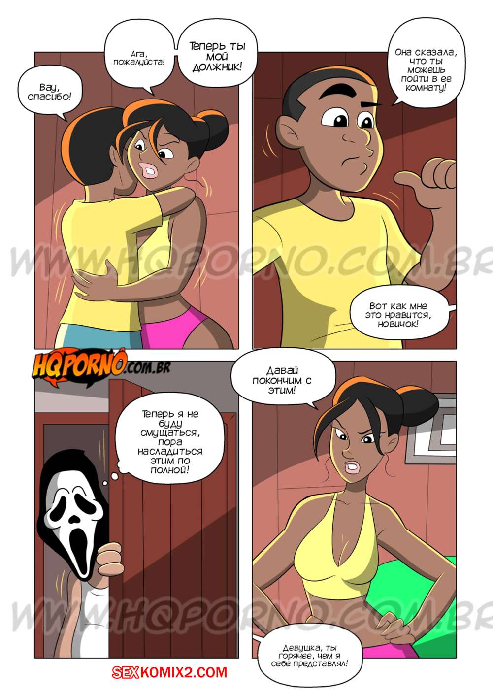 Порно комикс Семейка черных. Часть 11. Familia Black. HQporno Парень в маске стал шантажировать Веллингтона, чтобы трахнуть его сестру и мамку. Красотки беспокоятся на паренька, поэтому соглашаются и трахаются с парнем в маске.