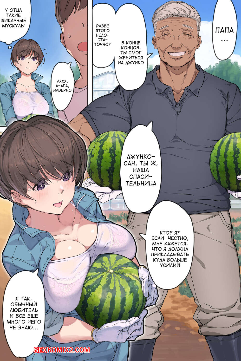 Порно комикс Жена фермера, непревзойденный свёкор и их особая практика. Yomoda Yomo Старик положил глаз на жену своего сына и решил воспользоваться моментом с ней наедине. Он раздел возбужденную брюнетку и отлизал ее пизденку, после чего хорошенько ее выебал.