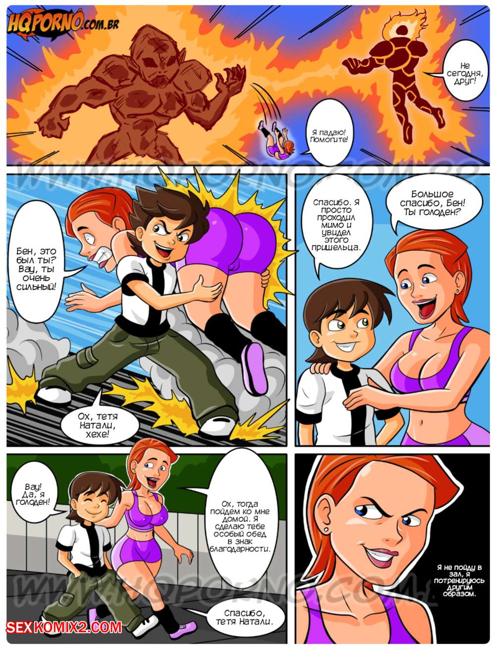 Порно комикс Бен 10. Часть 11. Benn 10. HQporno Бен спас горячую мамку Гвен от пришельца и она пригласила парня к себе домой, чтобы его облагодарить. Красотка разделась и отсосала хуй племянника мужа, после чего дала ему себя выебать.