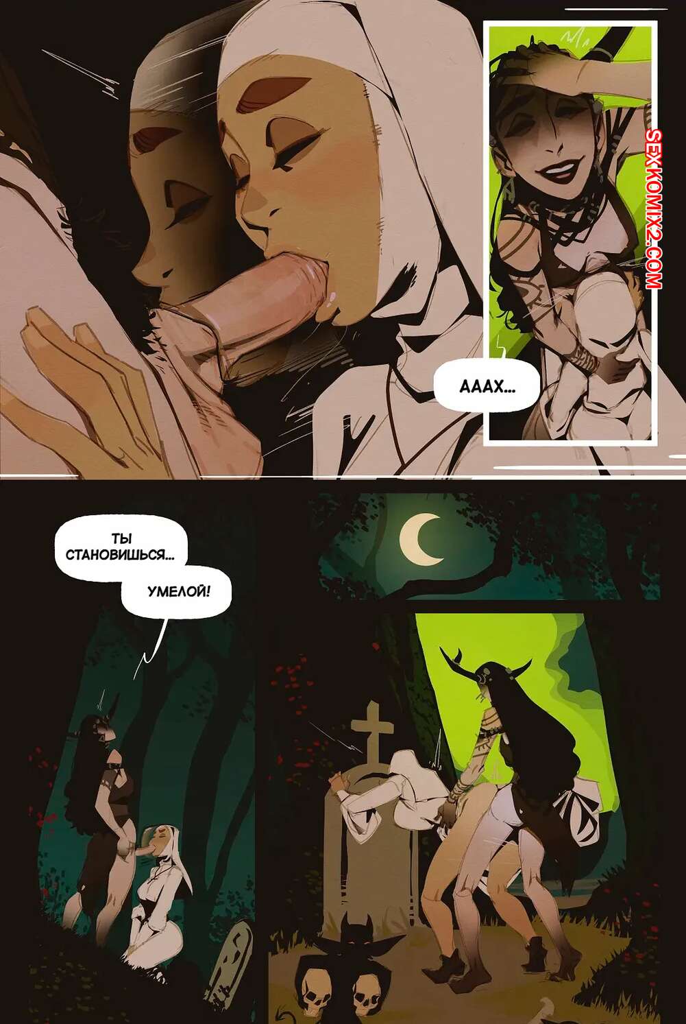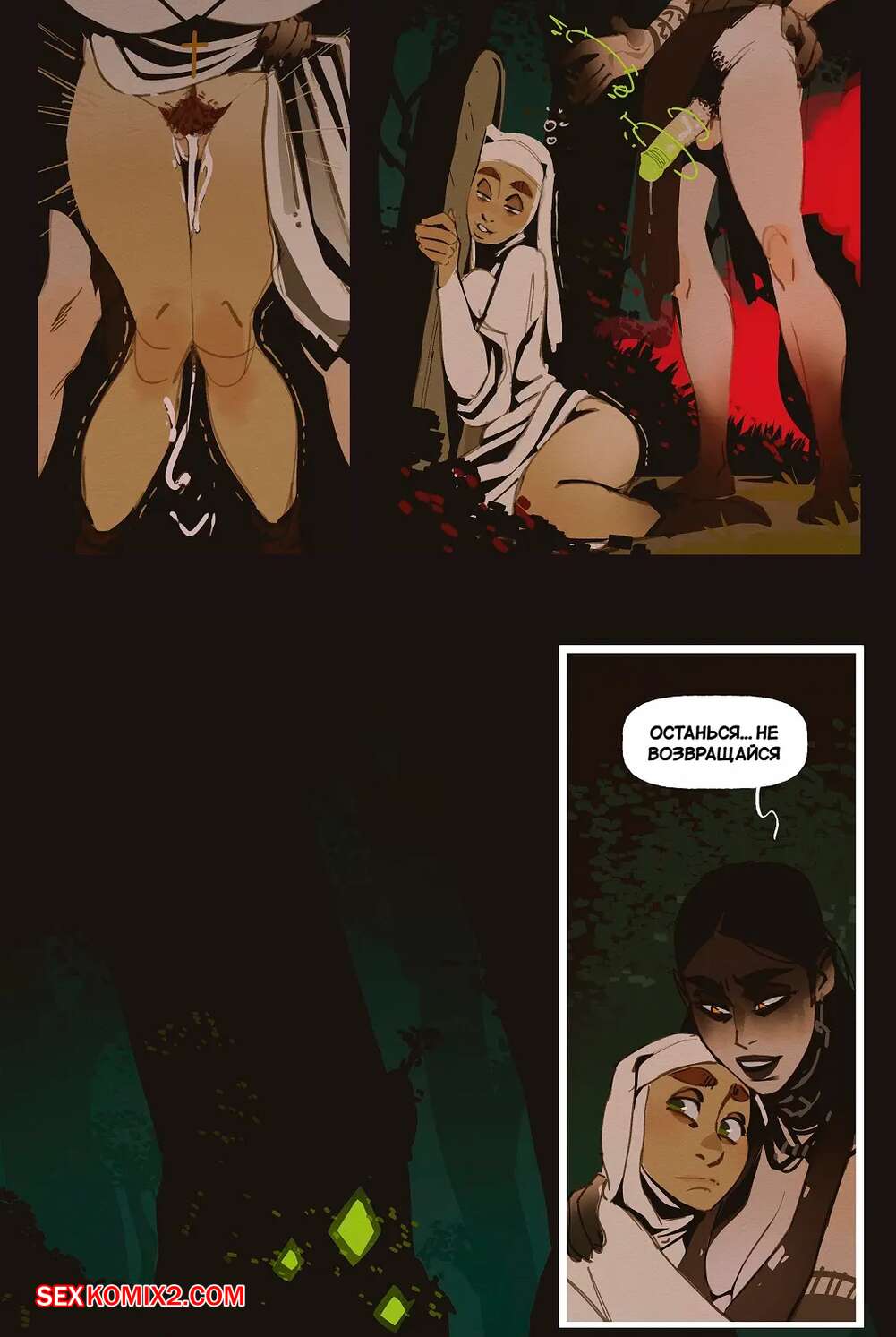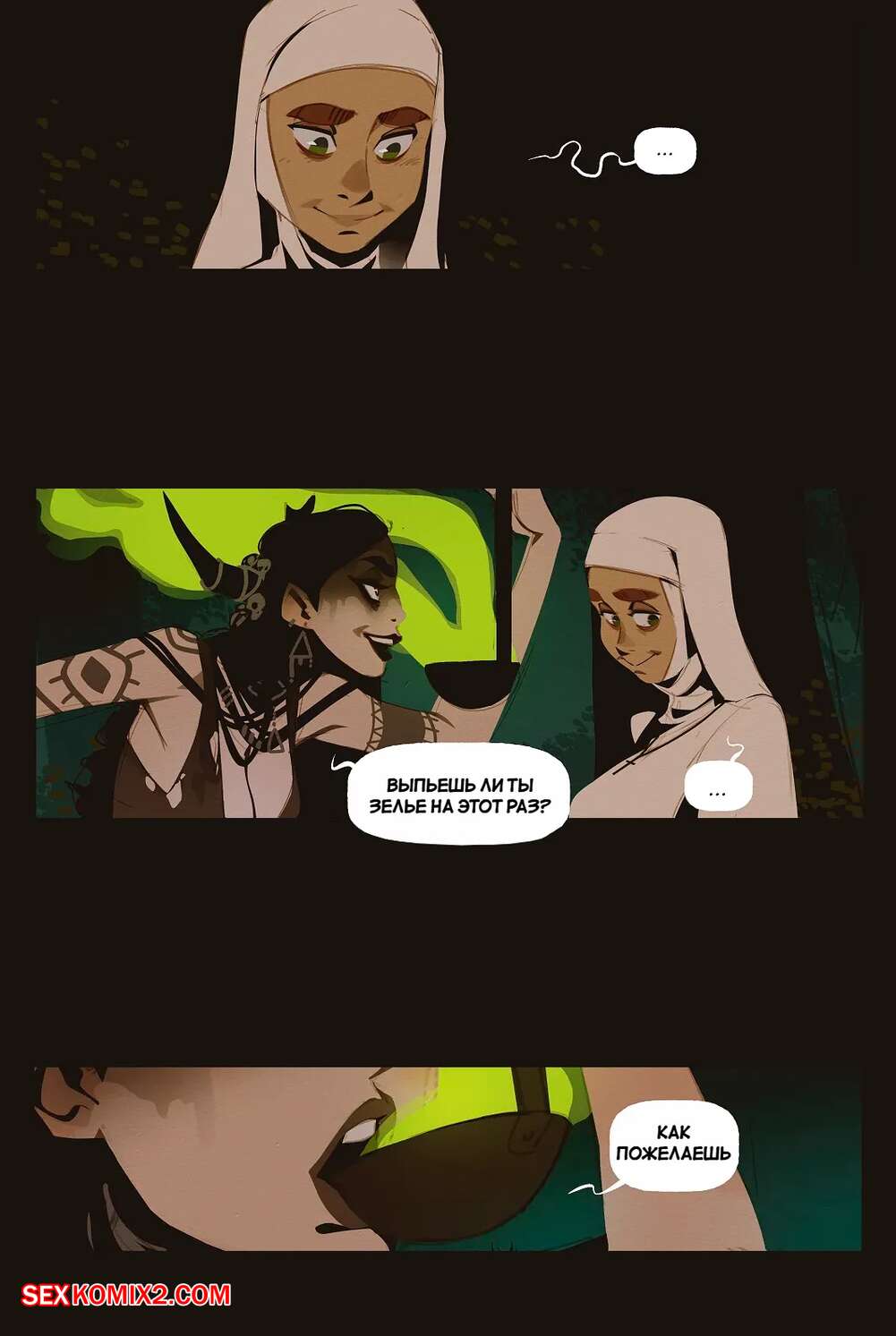 Порно комикс Ведьма и монашка. The Witch and the Nun. incase. Горячая монашка отправилась ночью в лес, где она встретила сексуальную ведьмочку. Та наколдовала себе член и как следует выебала пизденку своей новой подруги, получив удовольствие.