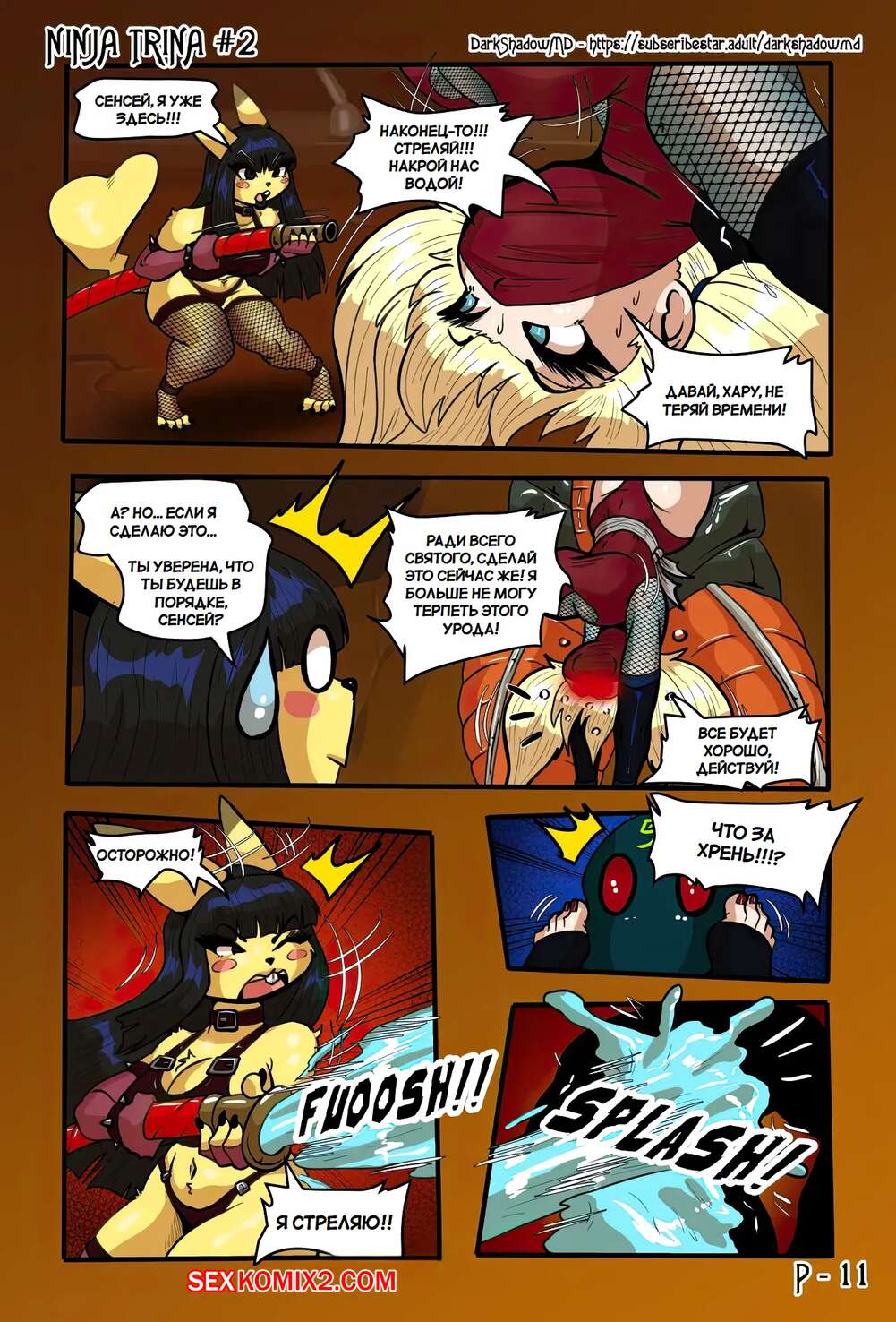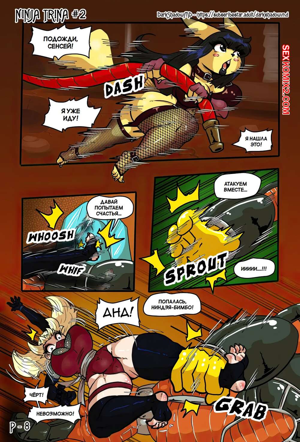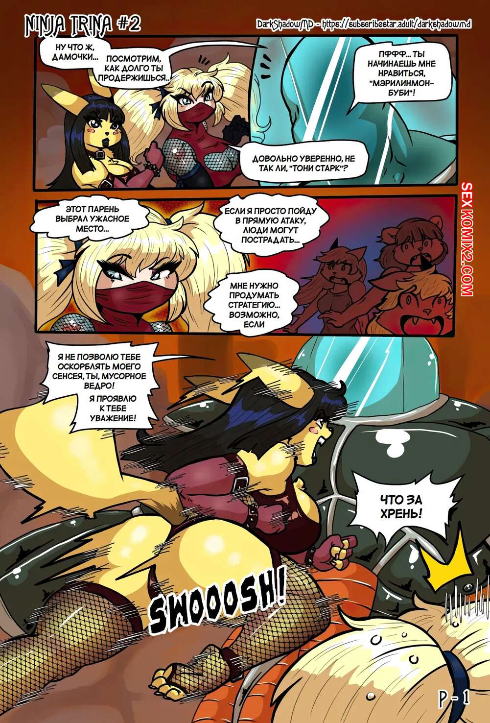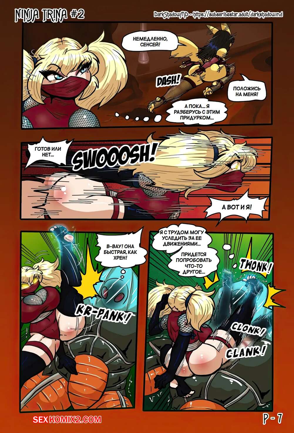 Порно комикс Ниндзя Трина. Часть 2. Ninja Trina. DarkShadow777 Горячие красотки ниндзя вступают в схватку с огромным роботом. Сперва девушкам удается наносить урон противнику, но затем он хватает девушек, чтобы выебать их с помощью щупалец.