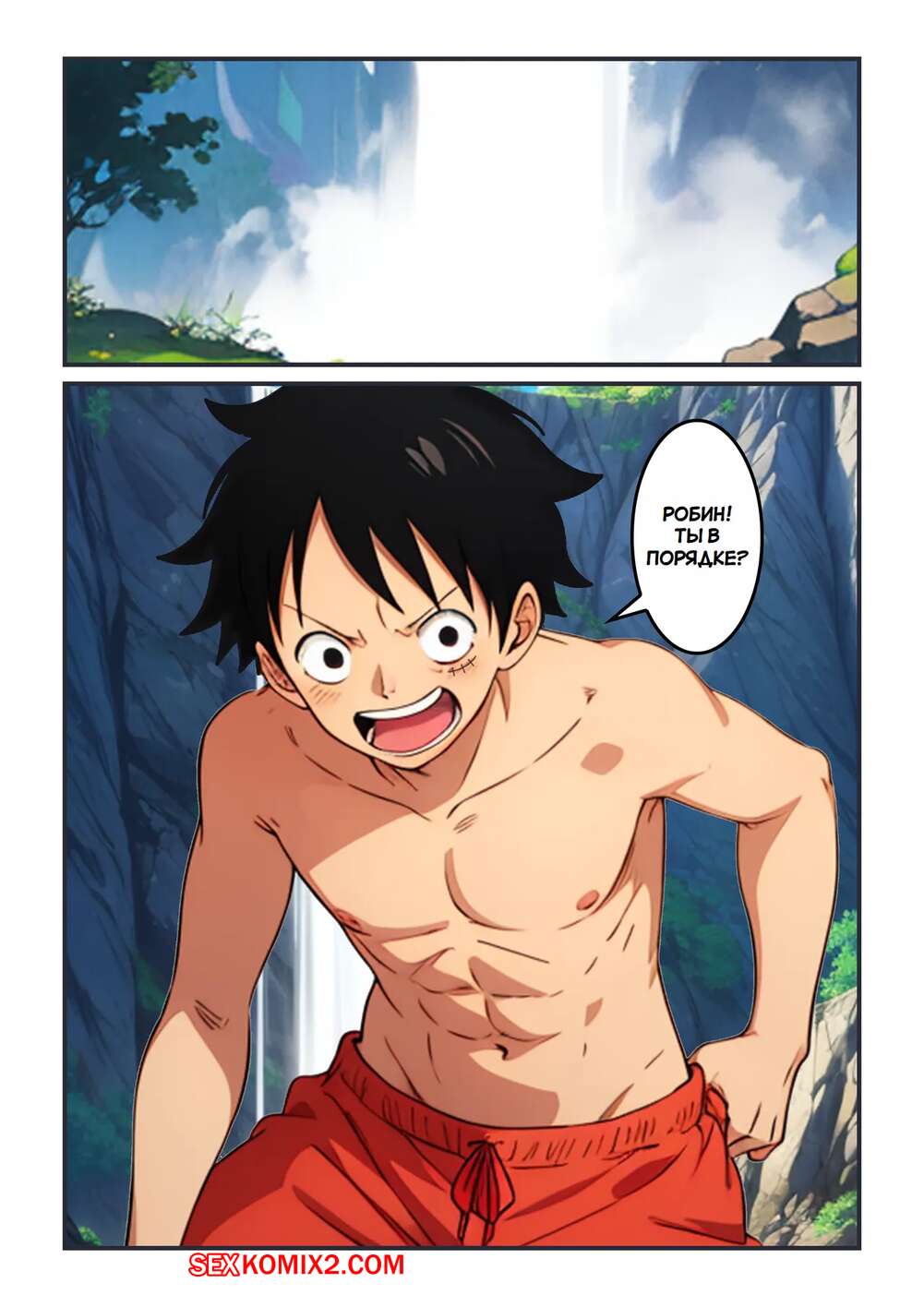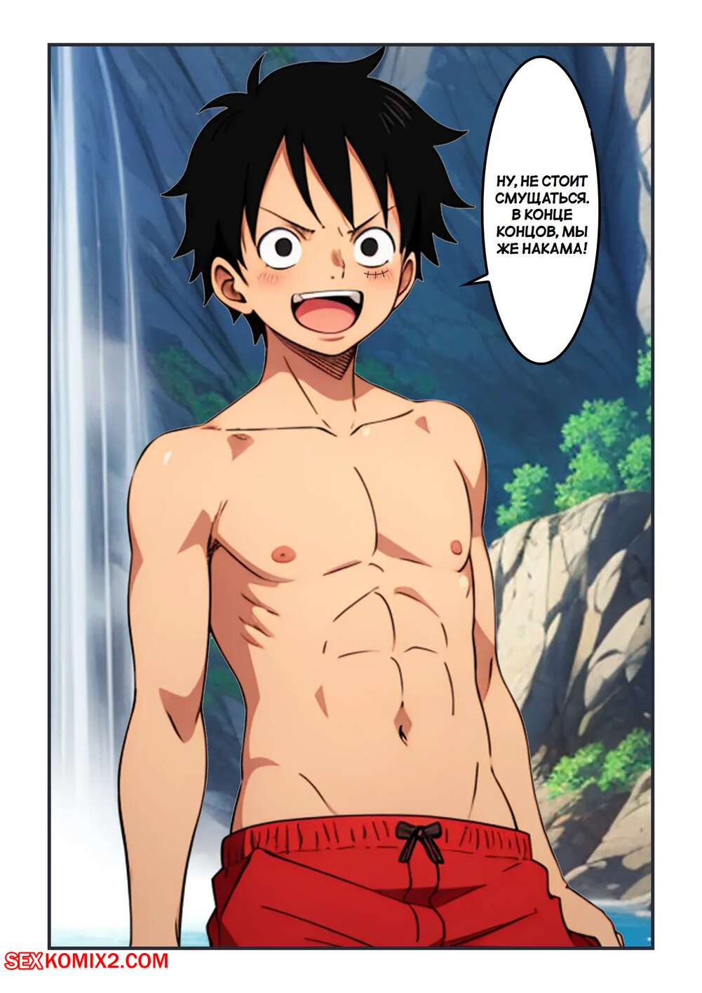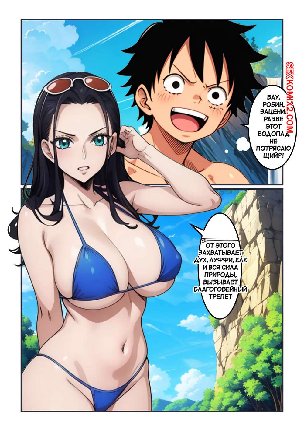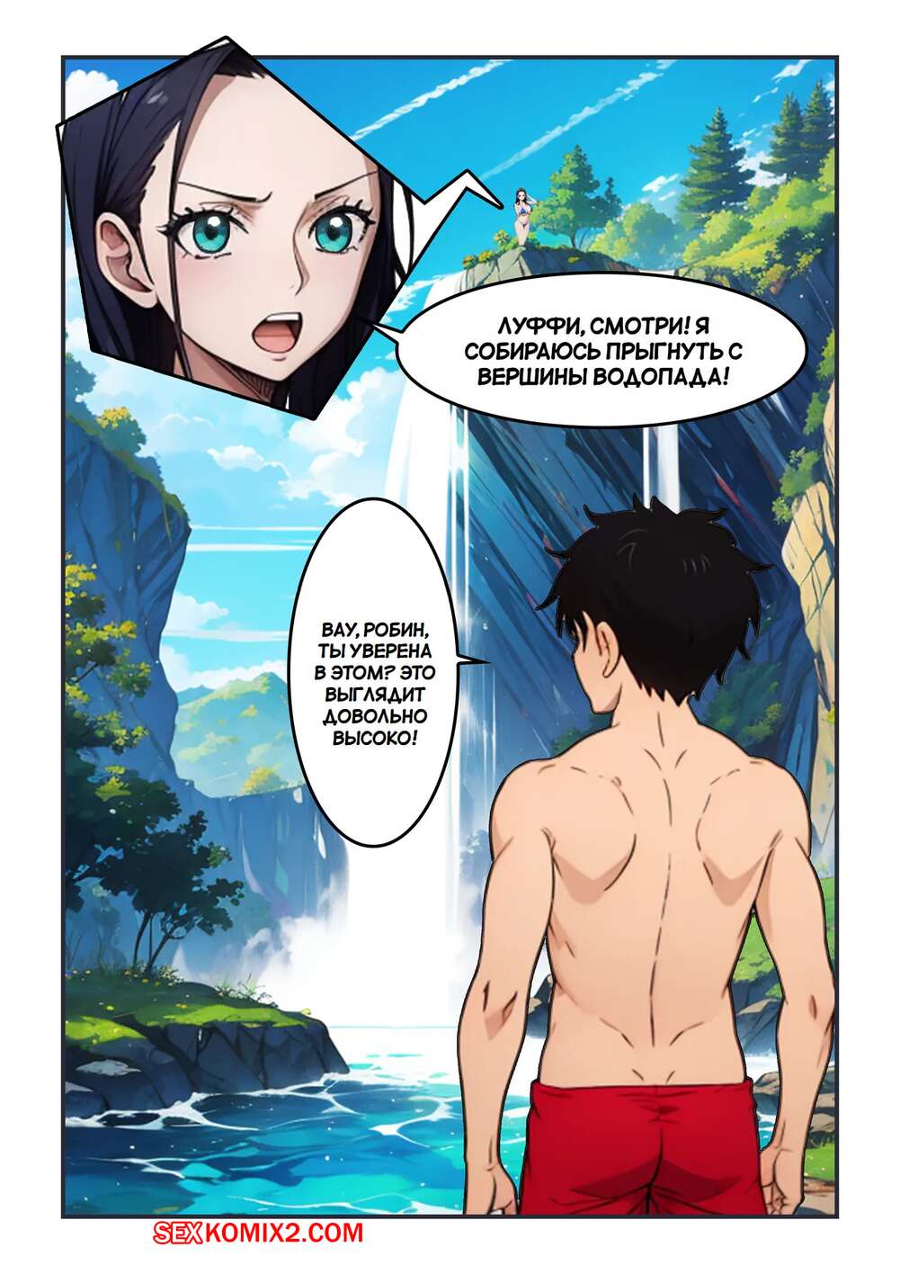 Порно комикс One Piece. Прыжок с водопада. Waterfall Escapade. Kahoo Горячая брюнетка спрыгнула с водопада и потеряла под водой верхнюю часть своего купальника. Голые сиськи возбудили паренька, который не смог сдержаться и стал сосать сиськи подруги.