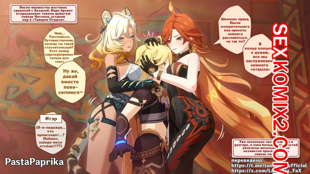 Порно комикс Genshin Impact. Natlan, Mavuika, Xilonen. PastaPaprika Горячие красотки были очень возбуждены и решили повеселиться со своим дружком. Они разделись и отсосали хуй парня, после чего дали ему себя хорошенько выебать.