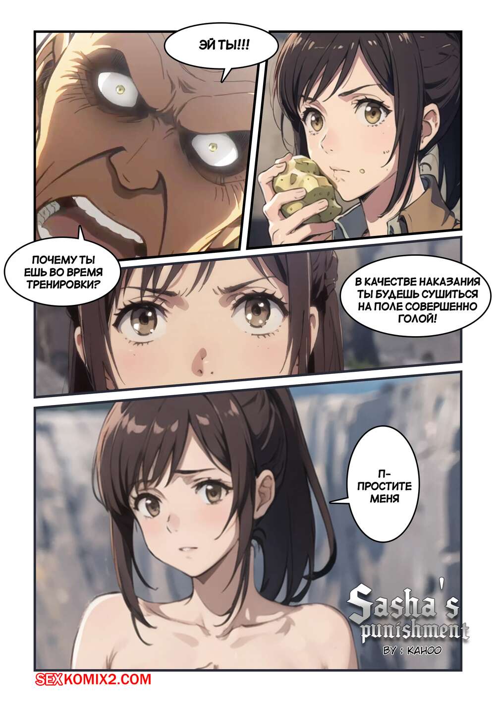 Порно комикс Атака Титанов. Наказание Саши. Sashas punishment. Kahoo Горячая красотка Саша отвеклась во время тренировки и старик решил ее наказать. Он приказал девушке раздеться и показать во всей красе свои шикарные формы.