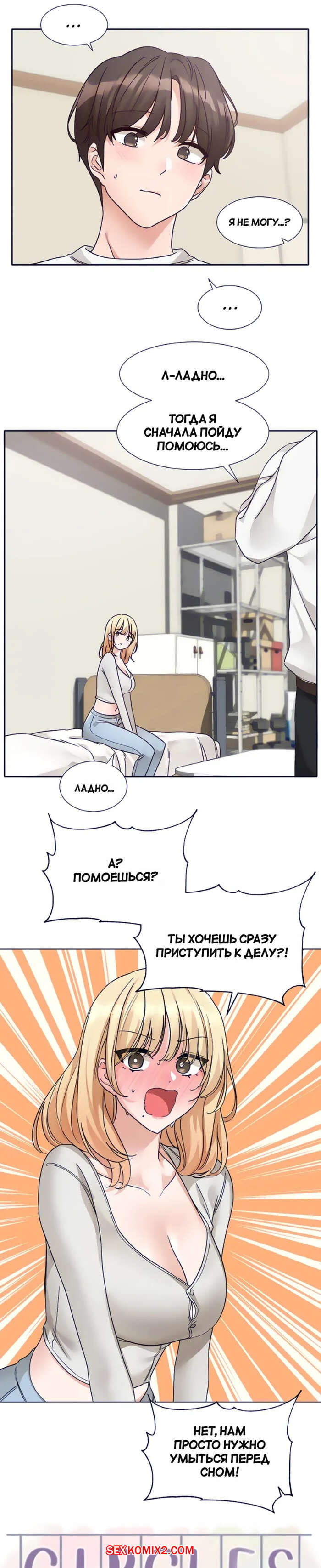 Порно комикс Театральный клуб. Часть 170. Circles. Theater cociety Горячая блондинка была очень возбуждена и хотела трахаться. Она разделась перед своим дружком и возбудила его шикарным телом, желая поскорее ощутить в себе член парня.