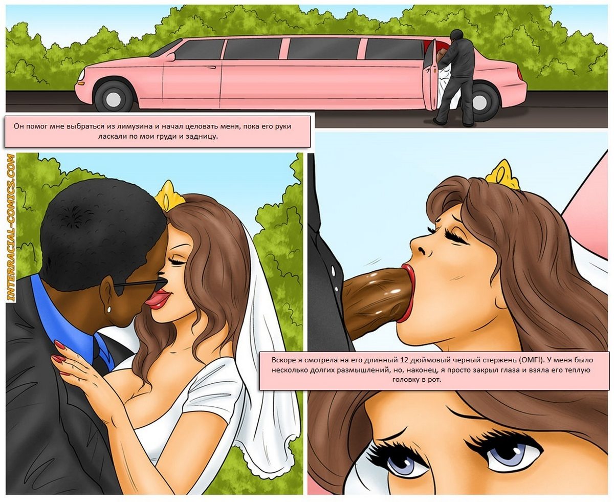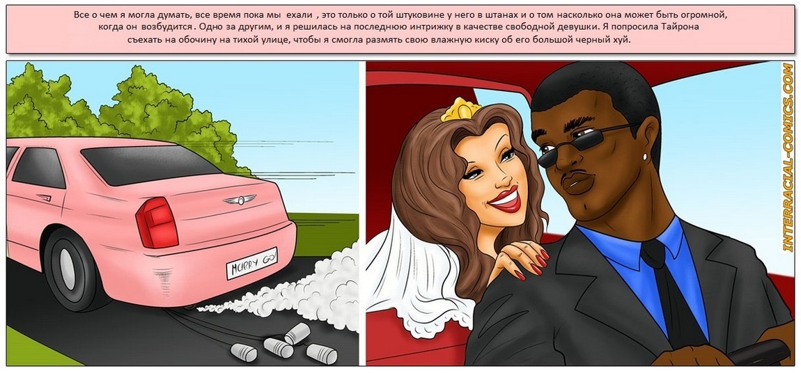 Порно комикс «В последний раз». Это история о том как чернокожий водитель лимузина повёз молодую невесту до церкви, где должно проходить её бракосочетание. Сексуальная блондинка в свадебном платье села в машину, всю дорогу водитель шутил и пытался развеселить её, чтобы отвлечь от волнения перед свадьбой. Ей сало очень хорошо с ним и девушка решила последний раз развлечься перед женитьбой. Она попросила остановить лимузин, вытащила чернокожего парня из машины, спустила с него штаны и начала сосать его огромный черный член. Он тоже не растерялся, снял нежно с неё свадебные трусики и трахнул невесту по жесткому.