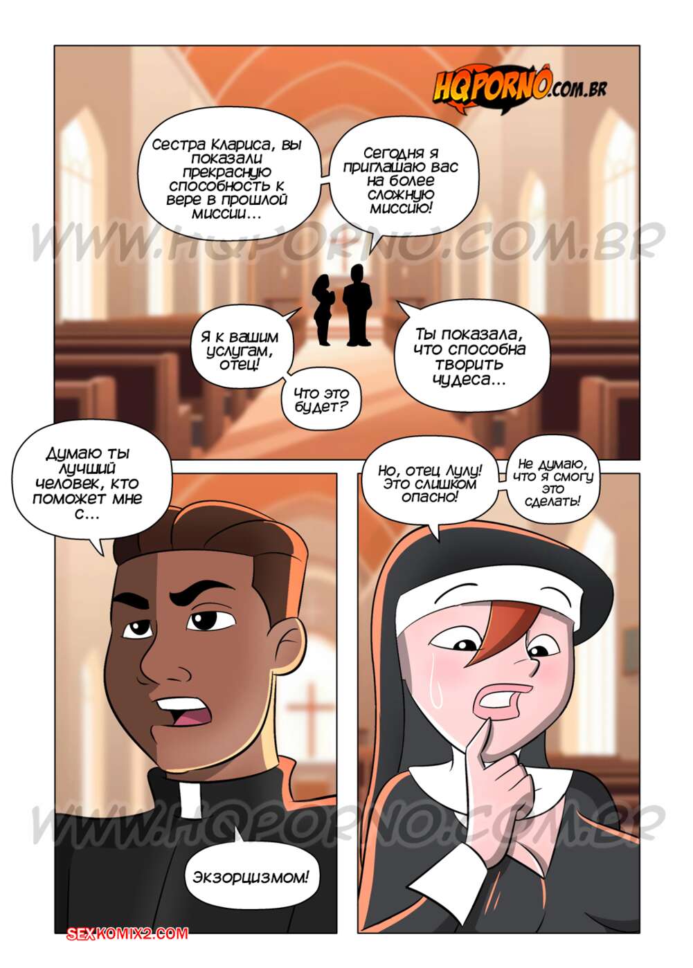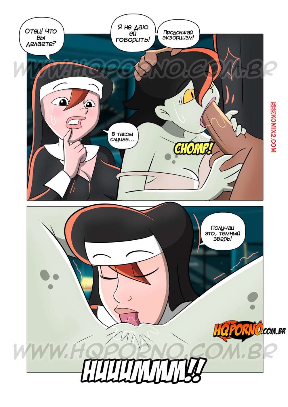 Порно комикс Монахиня. Часть 7. A freira. HQPorno Монахиня и святой отец отправились на экзорцизм юной девушки. Они раздели красотку и возбудили, после чего выебали ее во все дырочки, изгнав демона из брюнеточки.