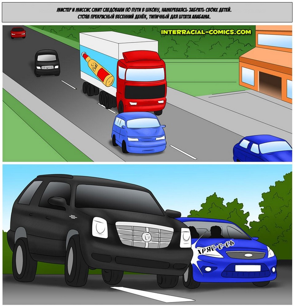 Порно комикс «Возмещение ущерба». Простой парень со своей женой, сексуальной блондинкой ехали по трассе и случайно зацепили соседнюю машину. Это был джип, из него вылезли чернокожие братки и потребовали денег за нанесенный ущерб. Парень зарабатывает не много и у него нет столько денег, но парням приглянулась его горячая жёнушка и они предложили трахнуть её в замен денег. Несчастному не хотелось подставлять свою спутницу, но выбора у него не было, тем более от виды накаченных черных тел девушка уже возбудилась и её трусики были мокрые.