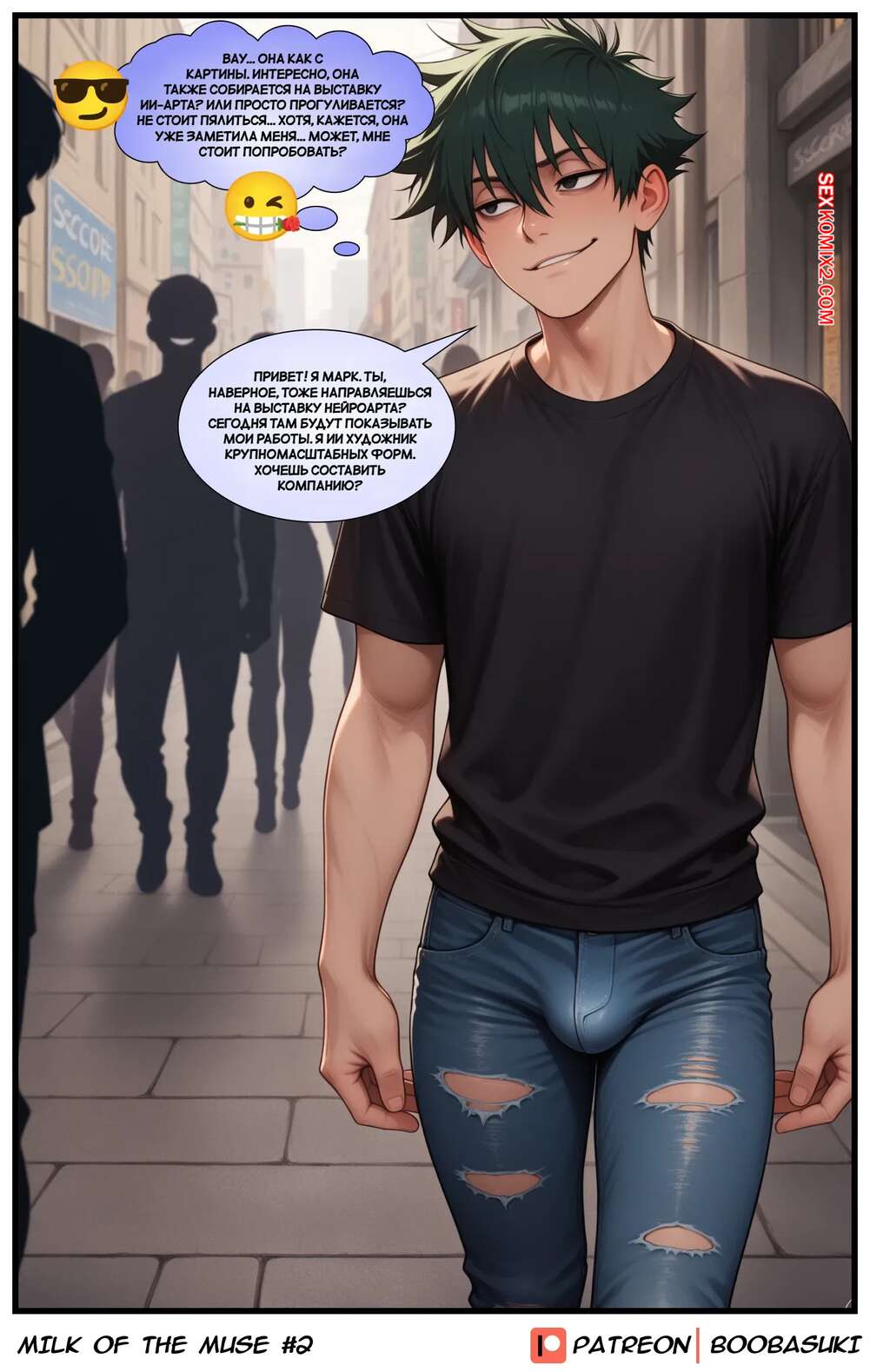 Порно комикс Молоко Музы. Milk of the Muse. boobasuki. Рыжая красотка с огромными сиськами гуляет по городу, привлекая внимание парней. Девушка оголяет свою грудь, после чего дает парням сососать свои сиськи и получить ее молочко.