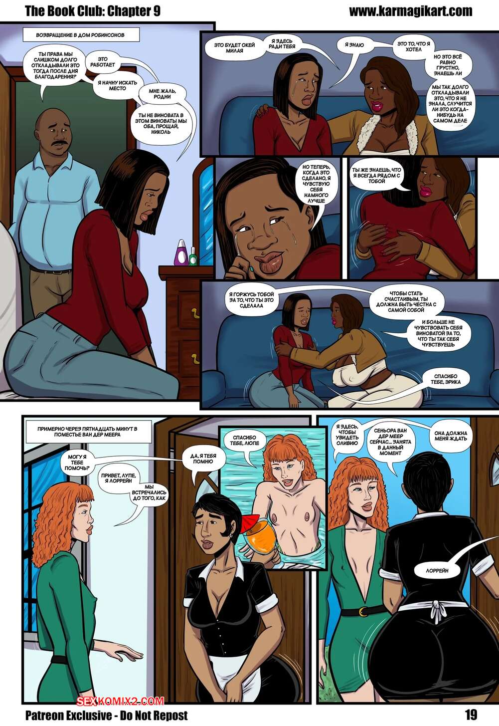 Порно комикс Книжный клуб. Часть 9. The Book Club. Karmagik Темнокожая милфа подцепила в клубе двух парней и отправилась с ними трахаться. Красотка разделась и отсосала хуи своих новых дружков, после чего дала им выебать себя во все дырочки.