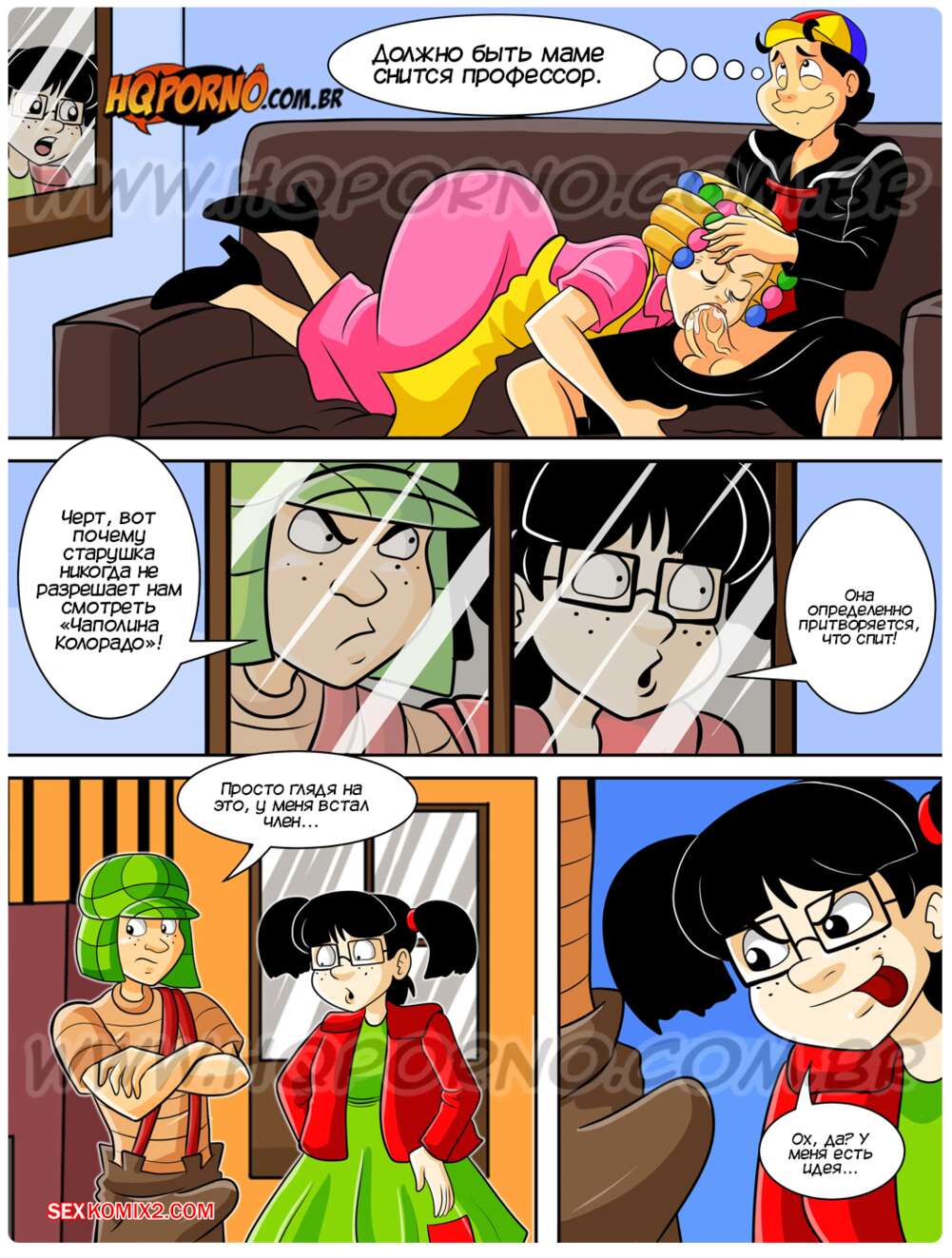 Порно комикс Чавиньо. Часть 23. Chavinho. HQporno Чавиньо и Чика подглядывали, как горячая милфа сосет член их друга Кику. Ребята возбудились и решили повеселиться. Девушка встала на колени и отсосала хуй друга, после чего дала ему себя выебать.