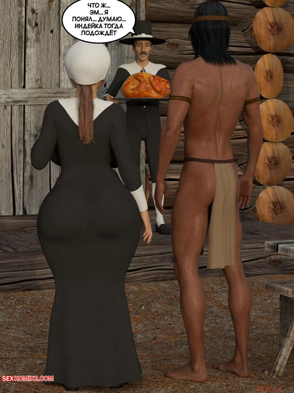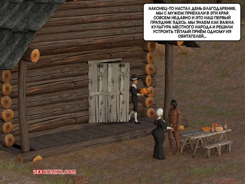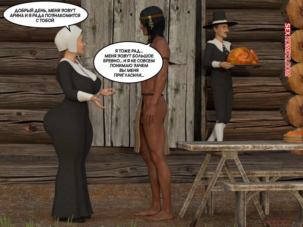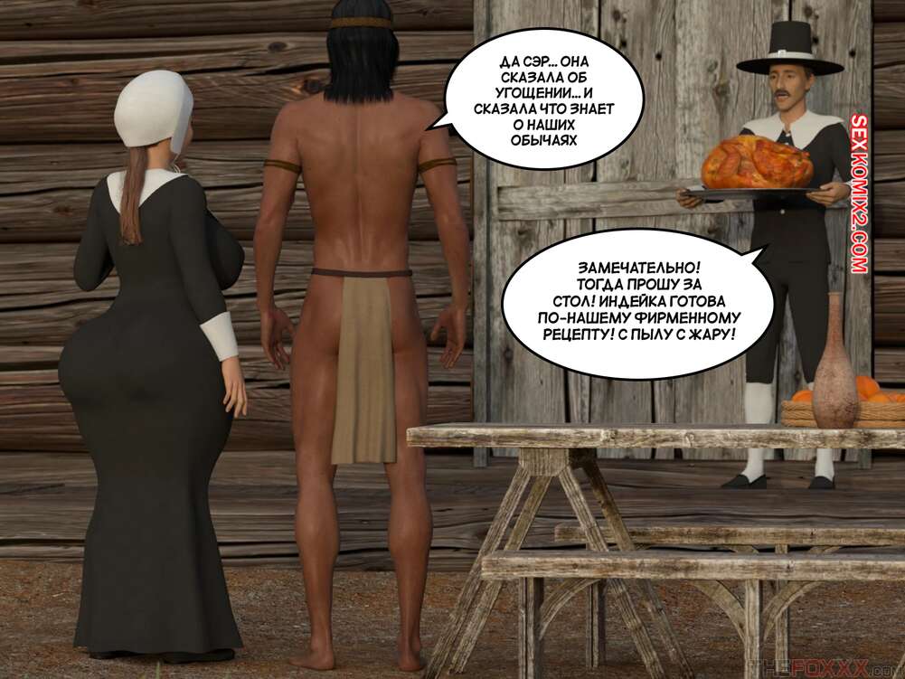 Порно комикс День благодарения. С текстом. Thanksgiving. The Foxxx Горячая милфа познакомилась с парнем и была поражена его огромным членом. Пока муж красотки накрывал на стол, она отсосала хуй нового знакомого и дала ему выебать свою попку.