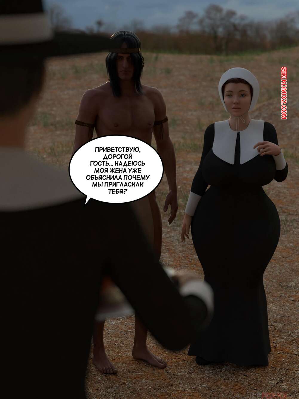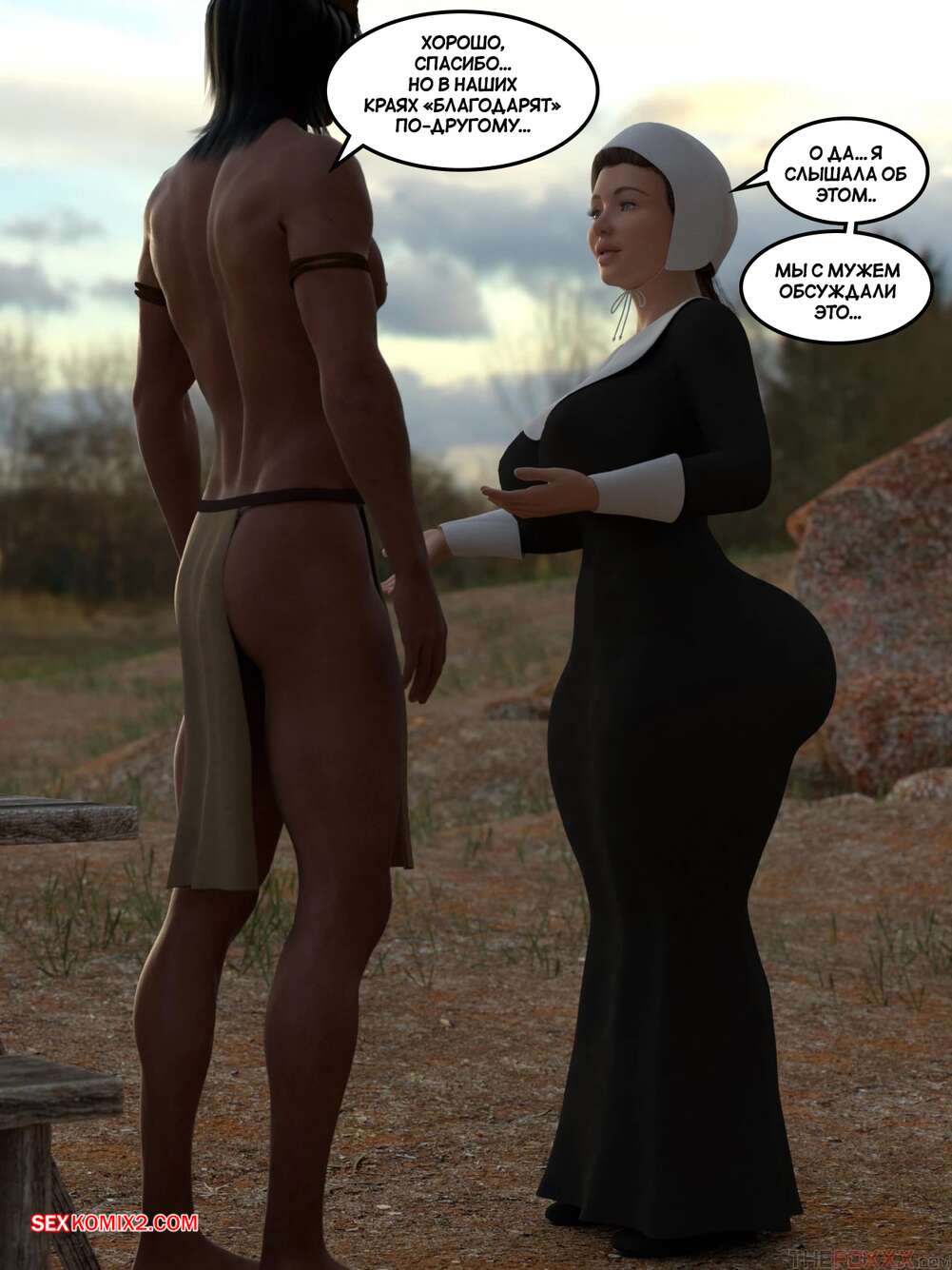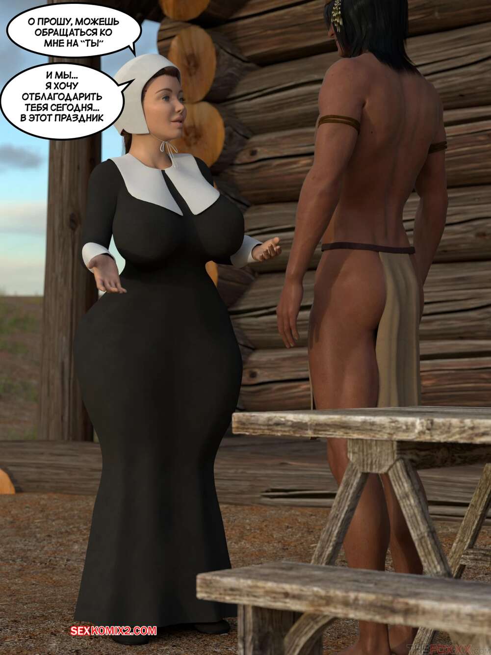 Порно комикс День благодарения. С текстом. Thanksgiving. The Foxxx Горячая милфа познакомилась с парнем и была поражена его огромным членом. Пока муж красотки накрывал на стол, она отсосала хуй нового знакомого и дала ему выебать свою попку.
