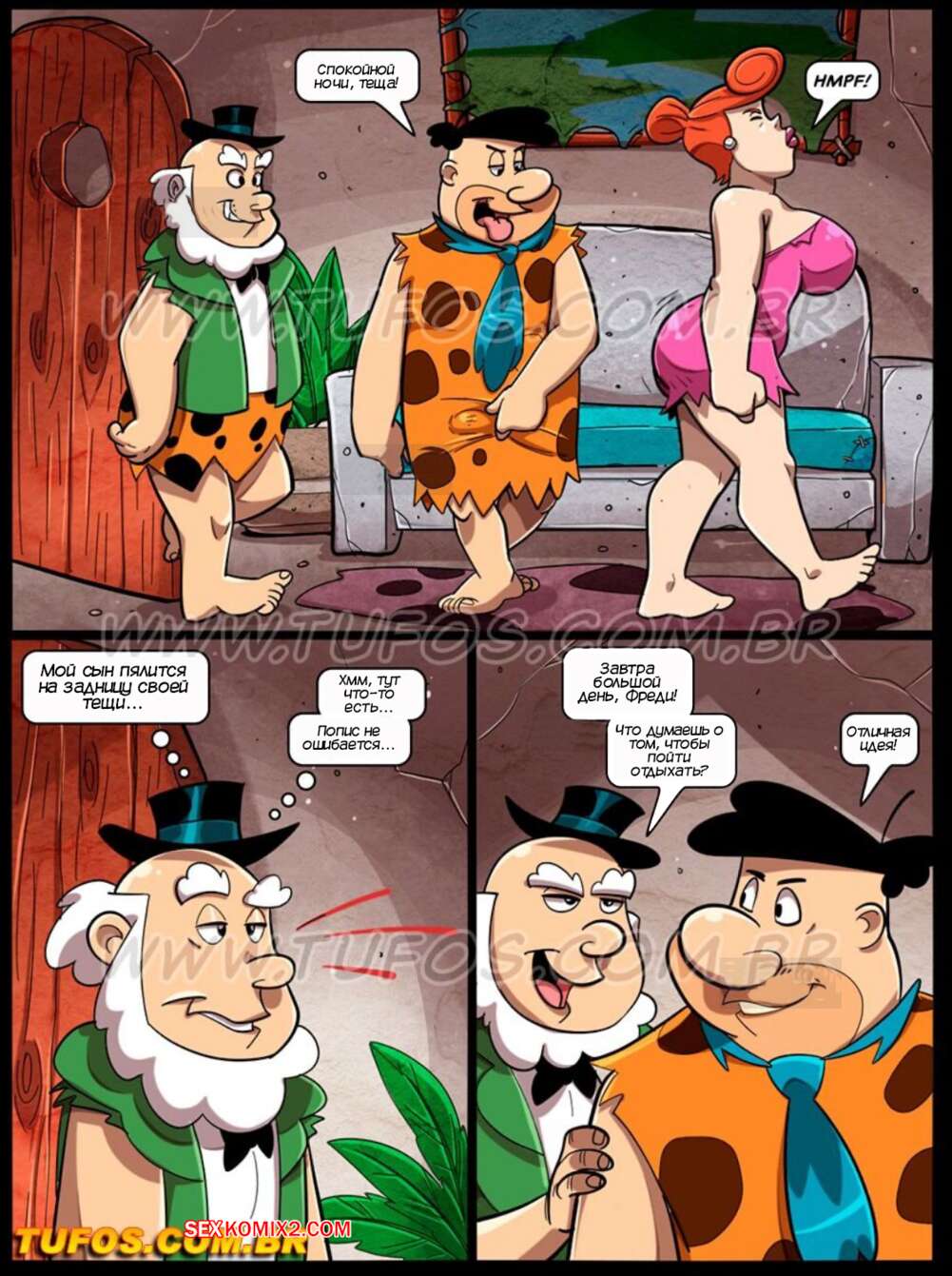 Порно комикс Флинстоуны. Часть 16. Os Flintstoons. Tufos У Фреди день рождения и к ним домой приехали его отец и теща. Ночью Фреди отправился в комнату матери своей жены, чтобы ее выебать, а тем временем Вилму трахнул ее свекр.