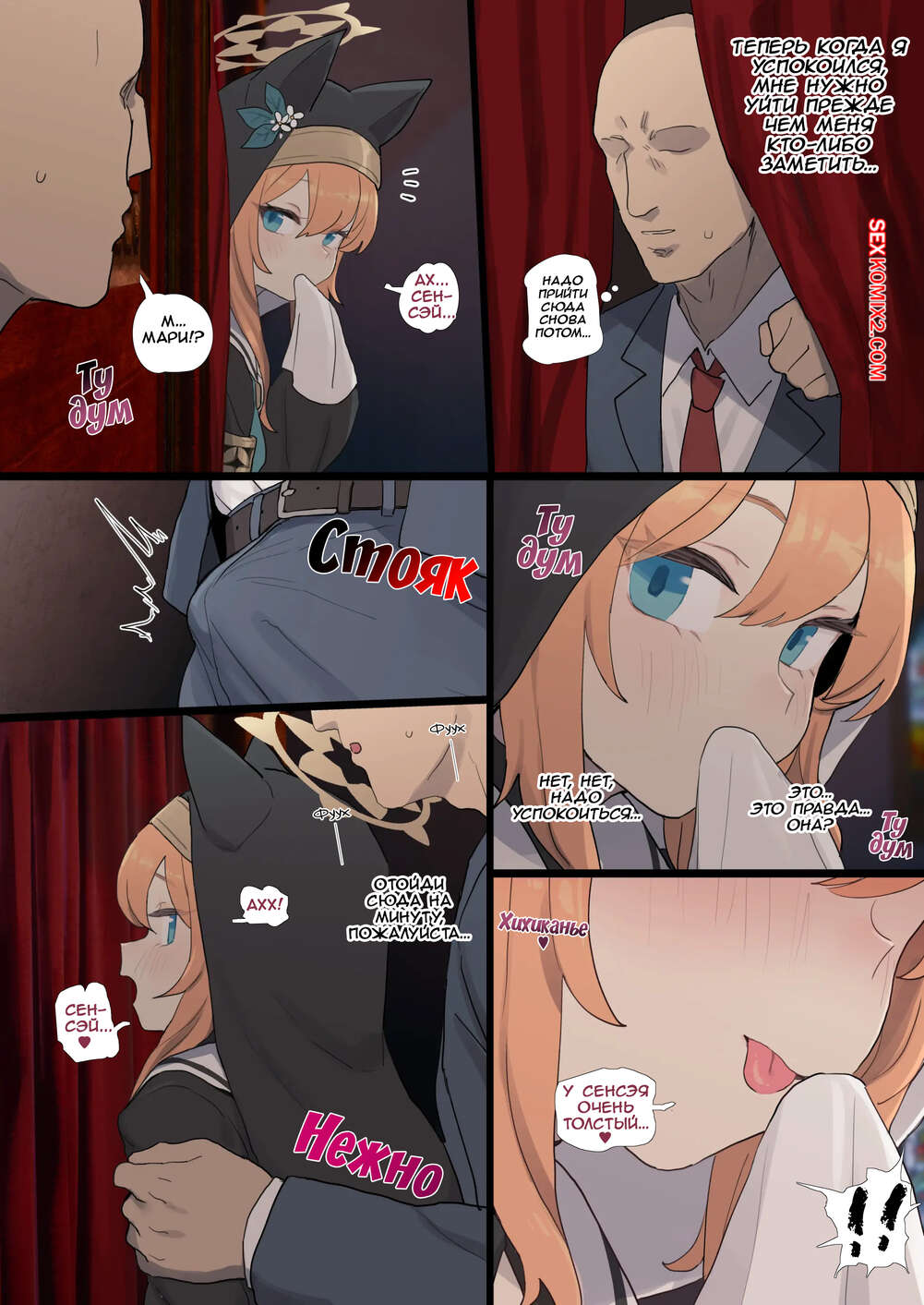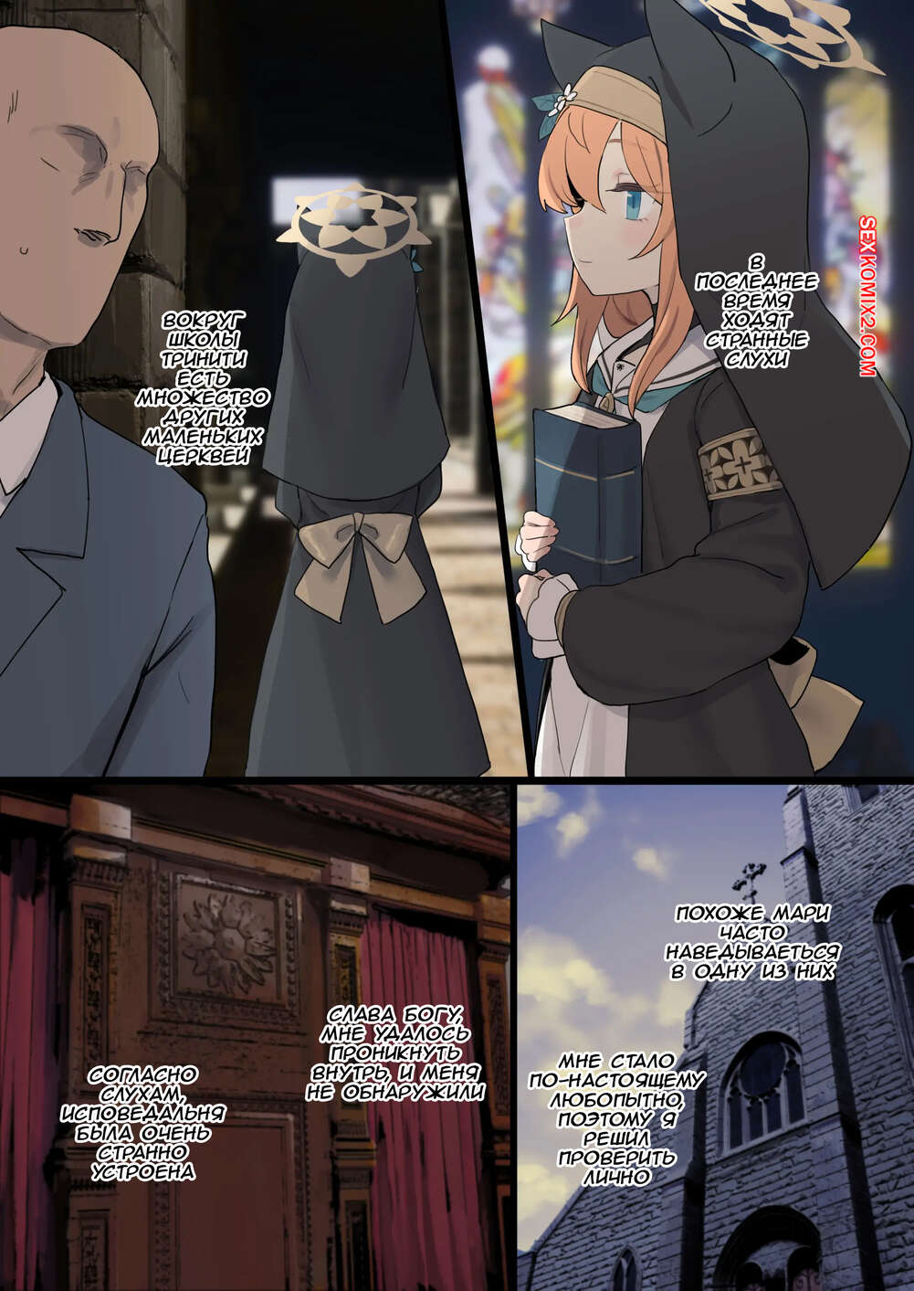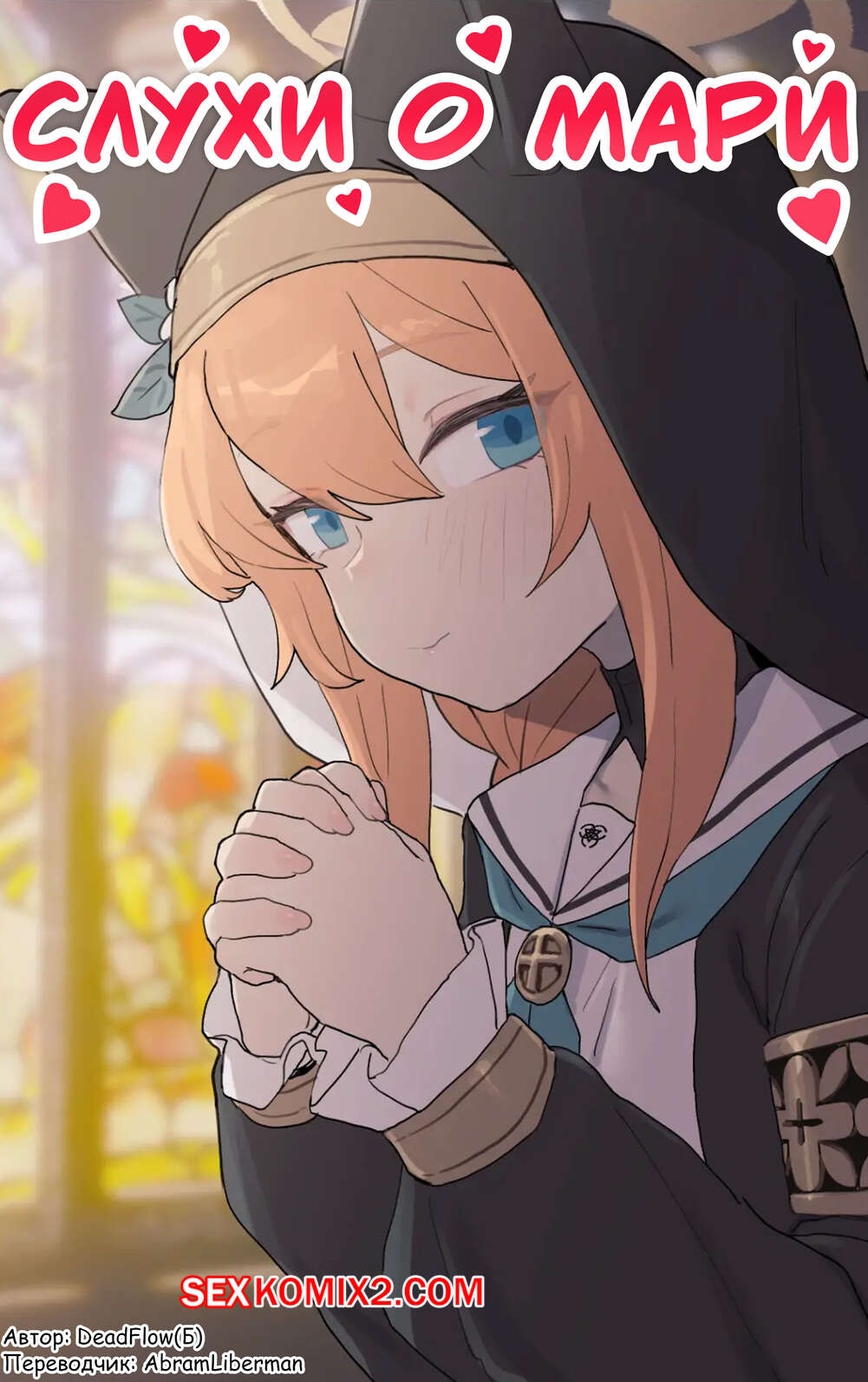 Порно комикс Blue Archive. Слухи о Мари. Maris rumor. deadflow Парень узнал о том, что рыжая монашка любит трахаться, и решил воспользоваться моментом. Он просунул красотке хуй через стену и она ему отсосала, после чего раздвинула ножки и дала себя выебать.