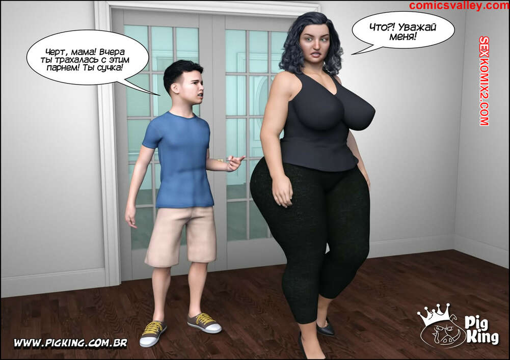 Порно комикс Марго. Часть 2. Margo. PigKing Эйдан спалил как его мамка трахалась с тренером и его это очень разозлило. Он стал шлепать задницу мамки, от чего она возбудила и позволила парню поиграться со своей пизденкой.