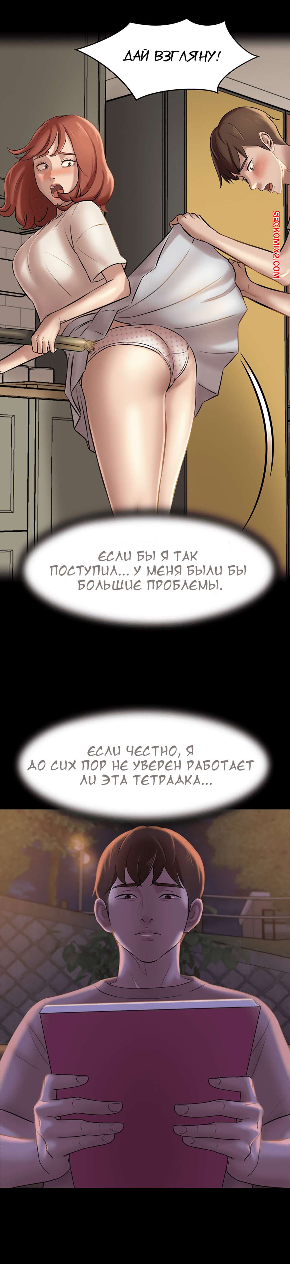 Порно комикс Тетрадь по трусикам. Части 13 и 14 и 15. Парнишка очень хотел выебать свою подругу, которая готовила у него на кухне, но он не мог внаглую подойти к ней и задрать юбку, чтобы увидеть ее трусики. Он пошел прогуляться и увидел как парочка целуется на лавочке и спалил трусики красотки. В итоге он пошел за ней в туалет, после того записал все в тетрадку и страстно ее выебал. Тетрадь начала работать как следует.