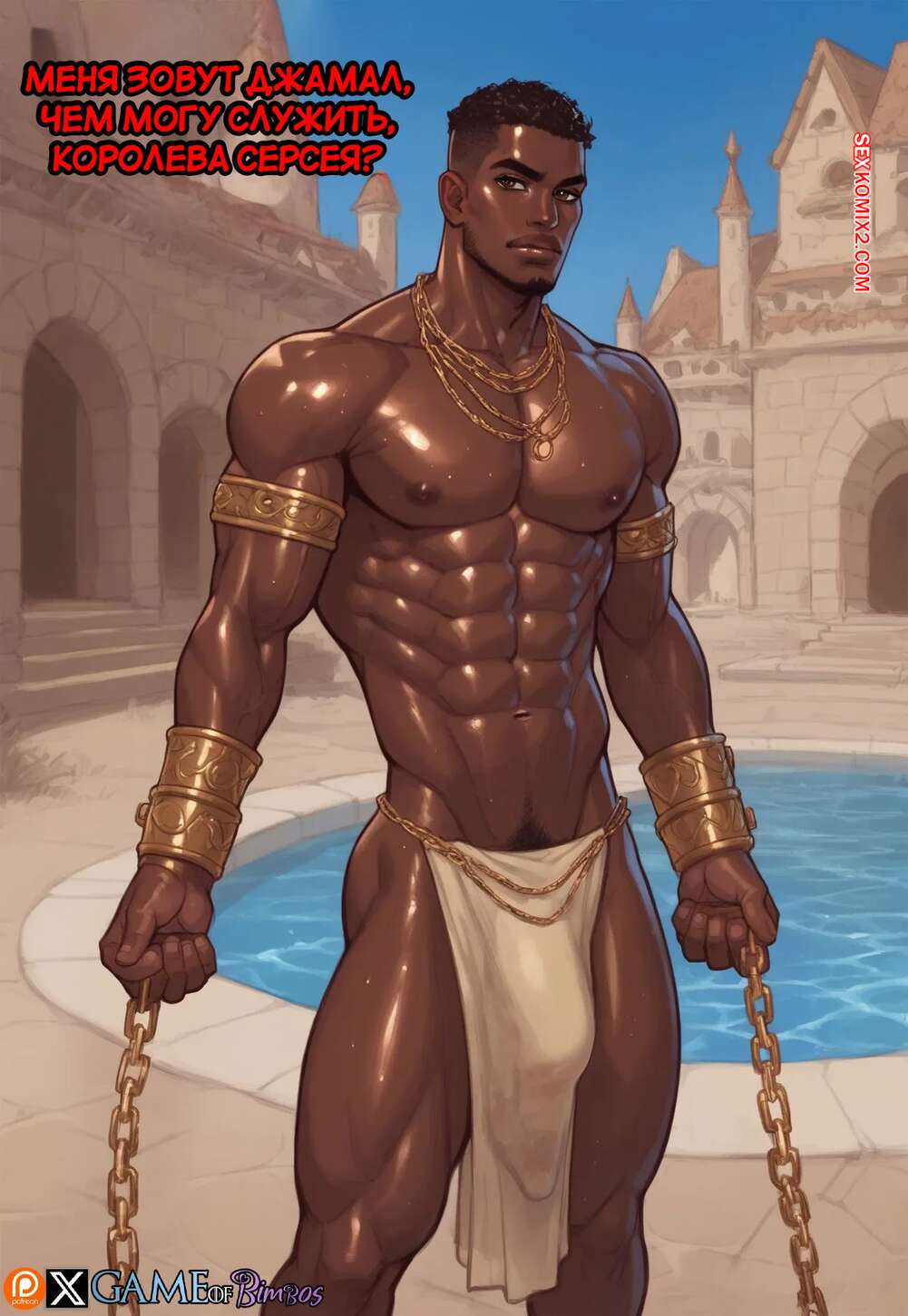 Порно комикс Помощь королеве. Queens Relief. Game of Bimbos. Сисястая блондинка милфа очень возбуждена и хочет трахаться. Она раздевается и соблазняет своих темнокожих подданых, после чего дает им выебать себя во все дырочки.