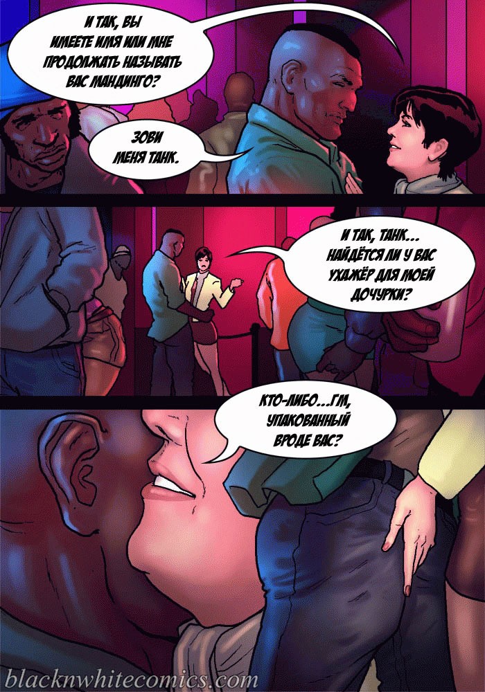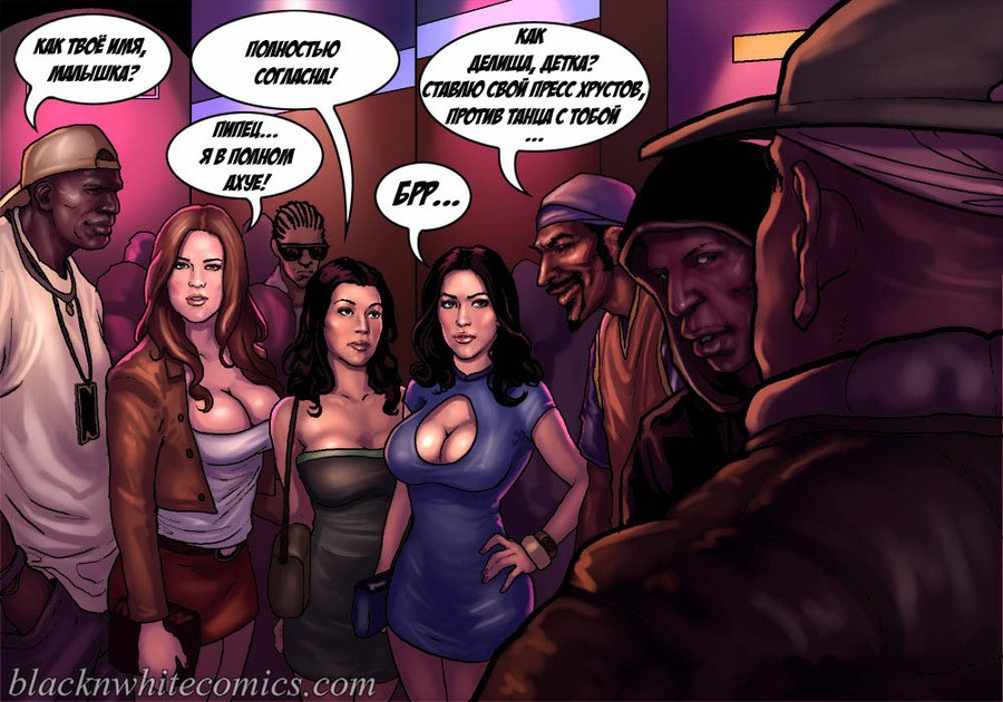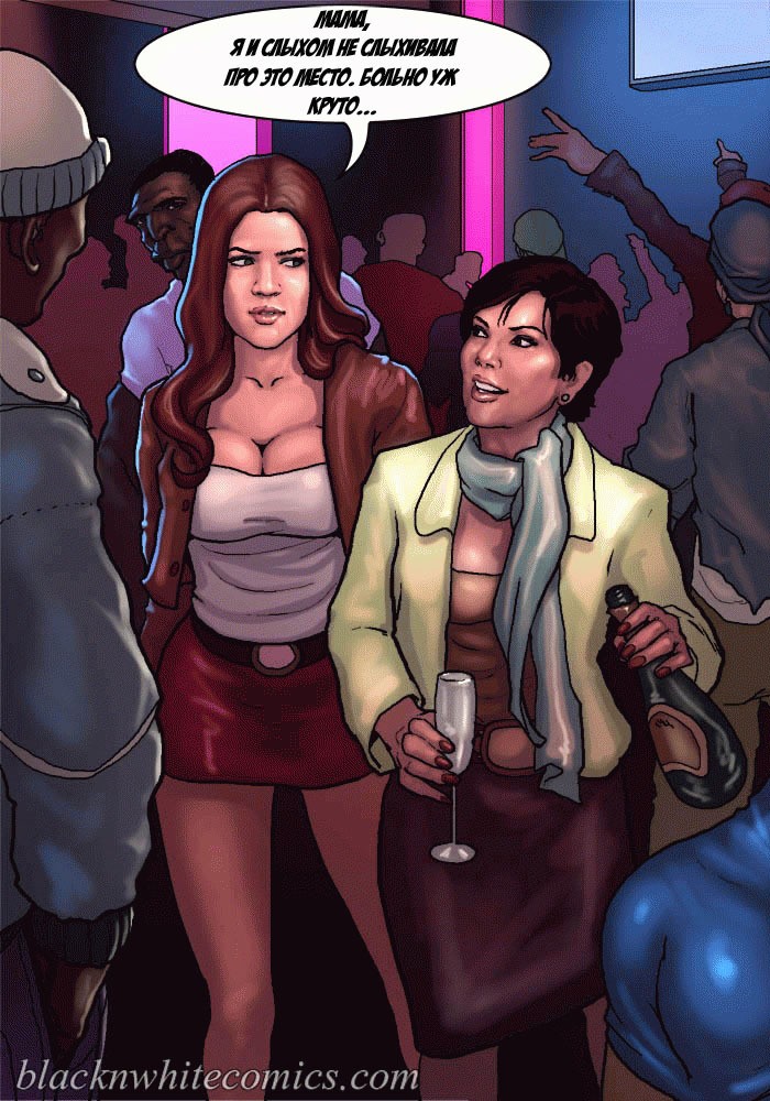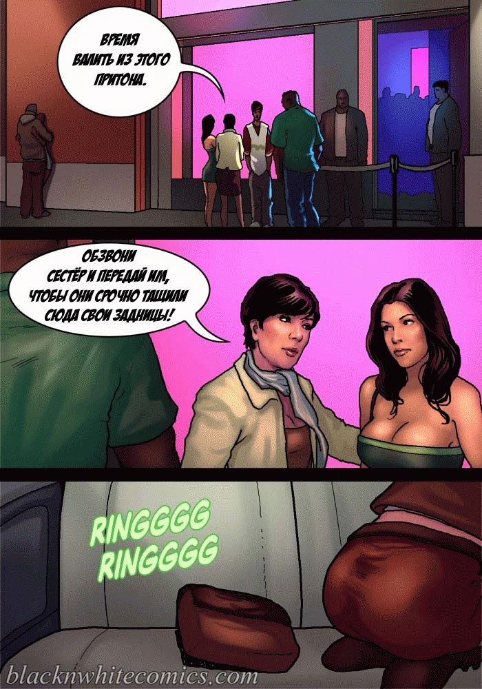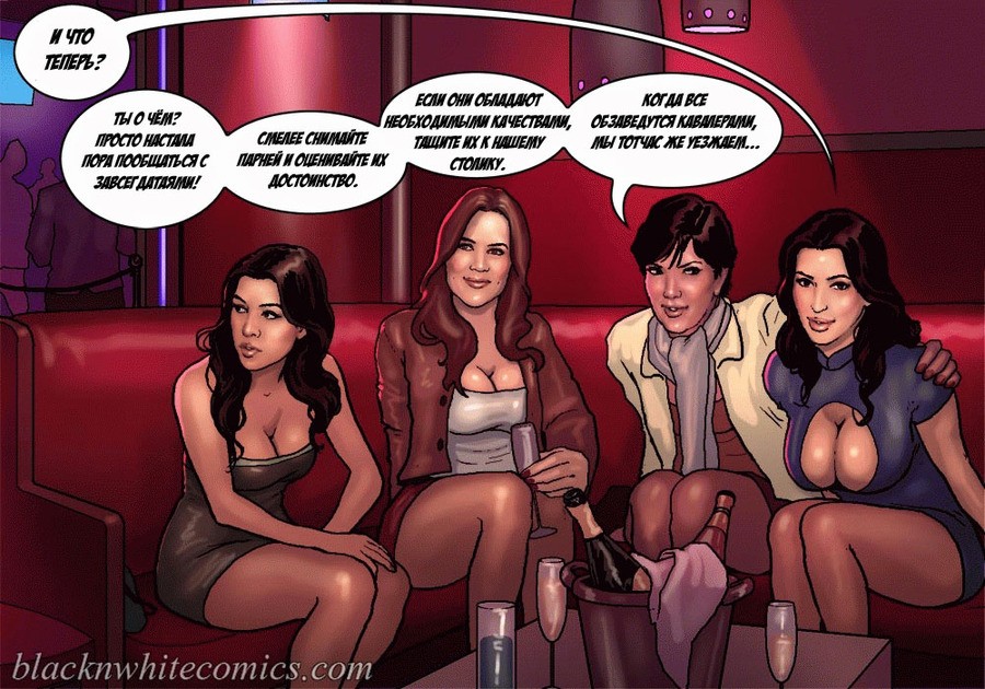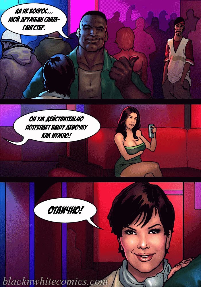 Порно комикс «Так держать семейка Карданшьян. Часть 2: Гетто». Три сексуальные сестренки пошли в ночной клуб, где обирают чернокожие парни из гетто. Их там встретила развратная мать и познакомила с парнями, милфа постоянно там ищем развлечений на свою дырку в заднице. Парни из клуба сразу оценили трёх красоток, как не заметить грудастых тёлочек! Одна из сестёр подцепила негра с самым большим членом и потащила его в туалет, чтобы проверить на что он способен. Когда он достал свой шланг и засунул его в рот оторве, он думала её рот не выдержит. Такого гиганта она ещё не принимала в себя!