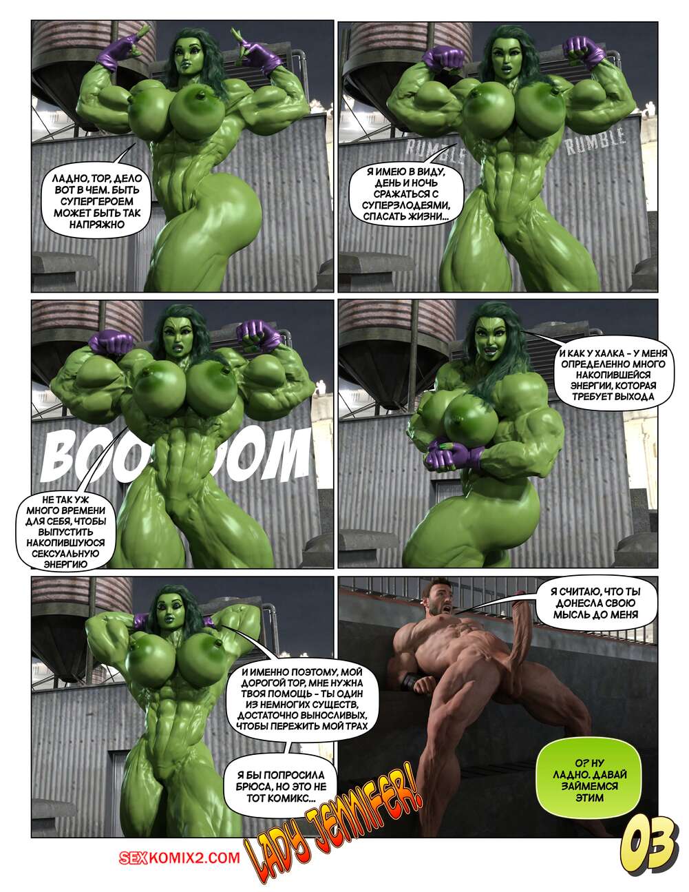 Порно комикс Marvel. Раскат грома. THUNDER SMASH. BSGstudio Тор согласился помочь Женщине Халк и отправился с ней на миссию. Возбужденная красотка решила забить на спасение города и повеселиться с напарником. Девушка быстро разделась, после чего стала дрочить сиськами хуй бога грома.