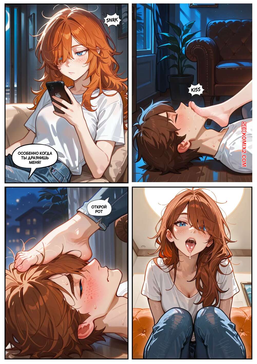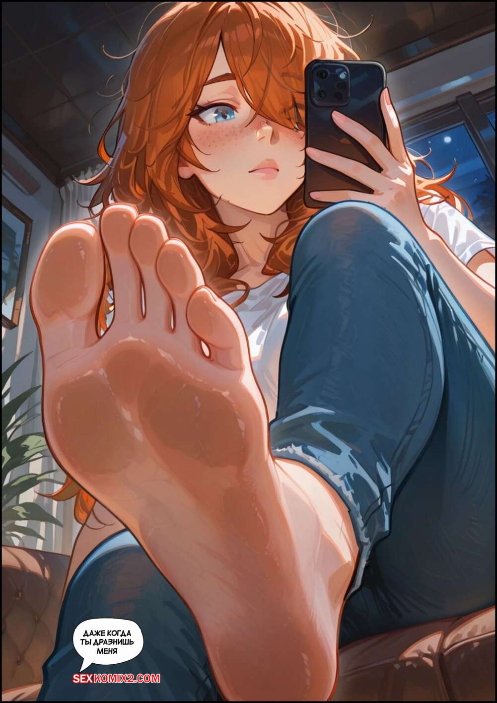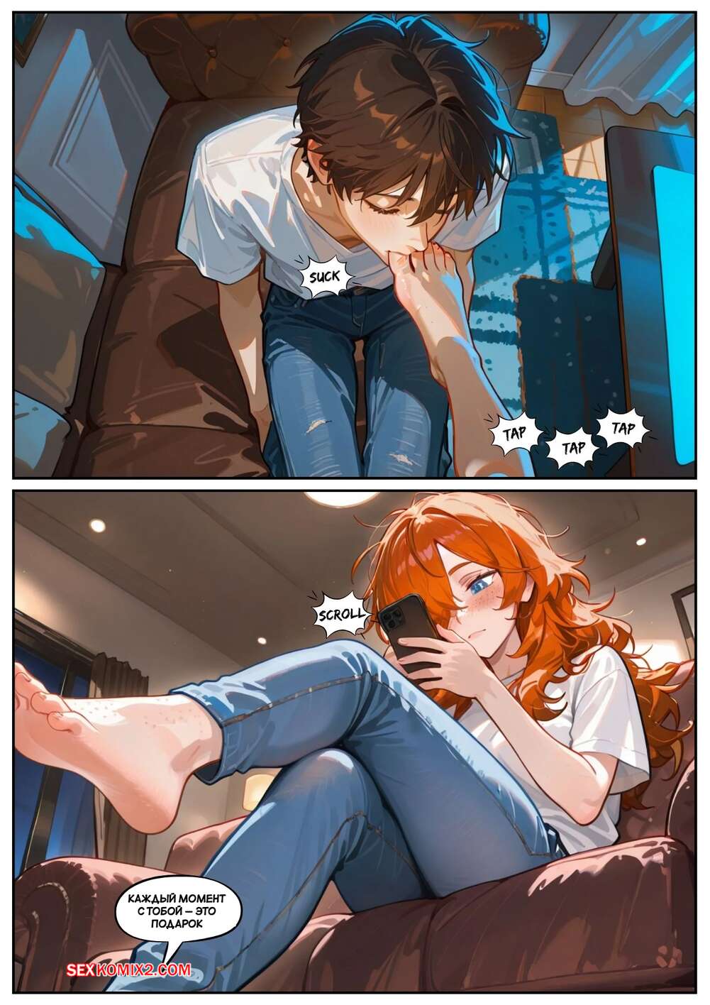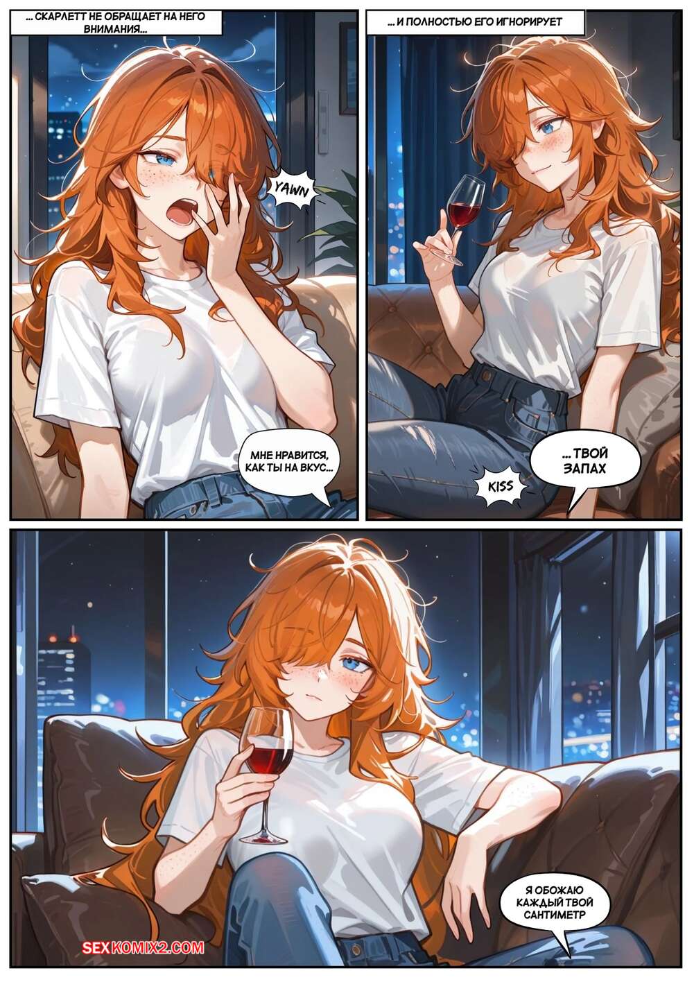 Порно комикс Скарлет Блейз. Часть 3. Не замечая ее Парень с девушкой выпивали вино, после чего рыжуля решила пошалить. Она стала массировать ножками член парня, после чего сняла трусики и дала ему попробовать на вкус свои дырочки.