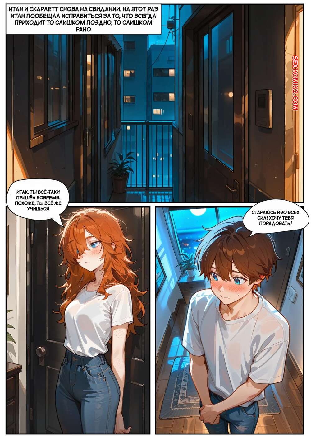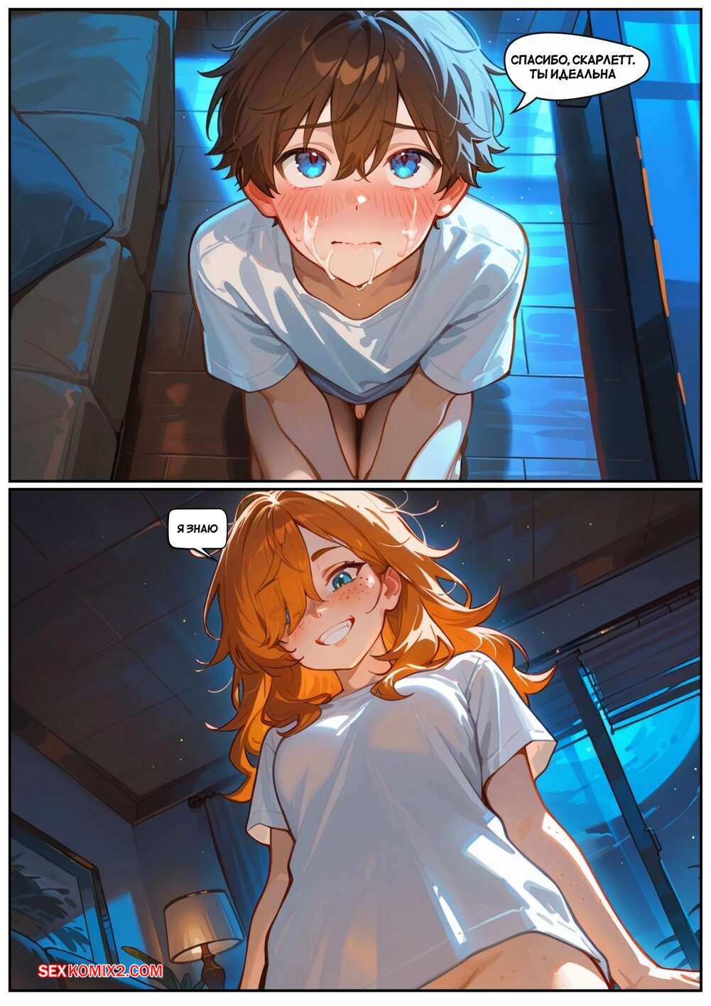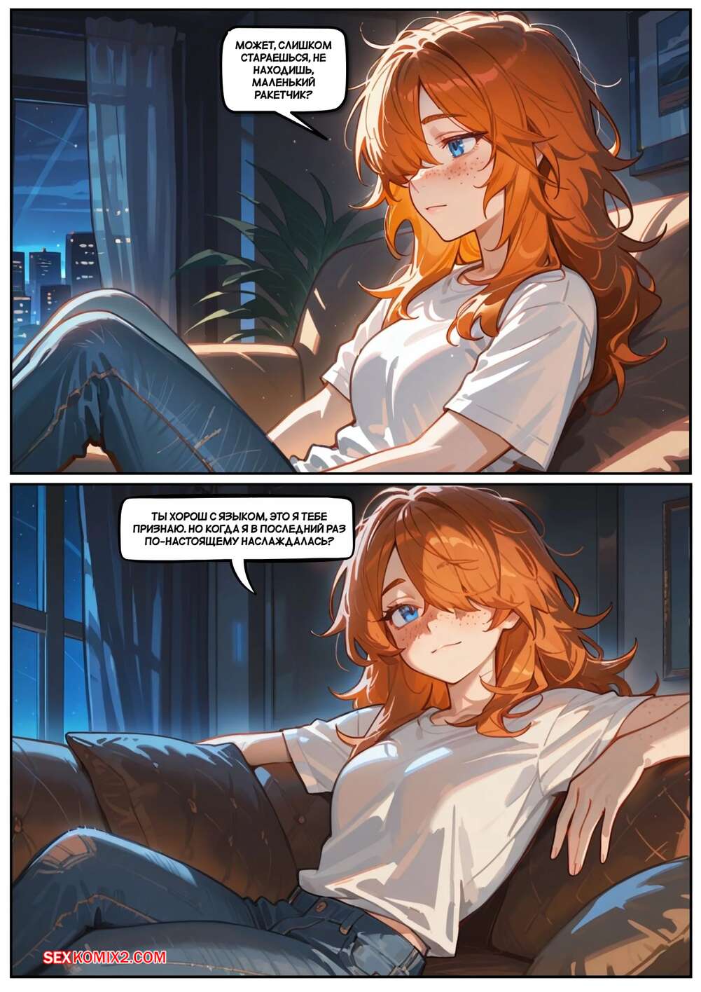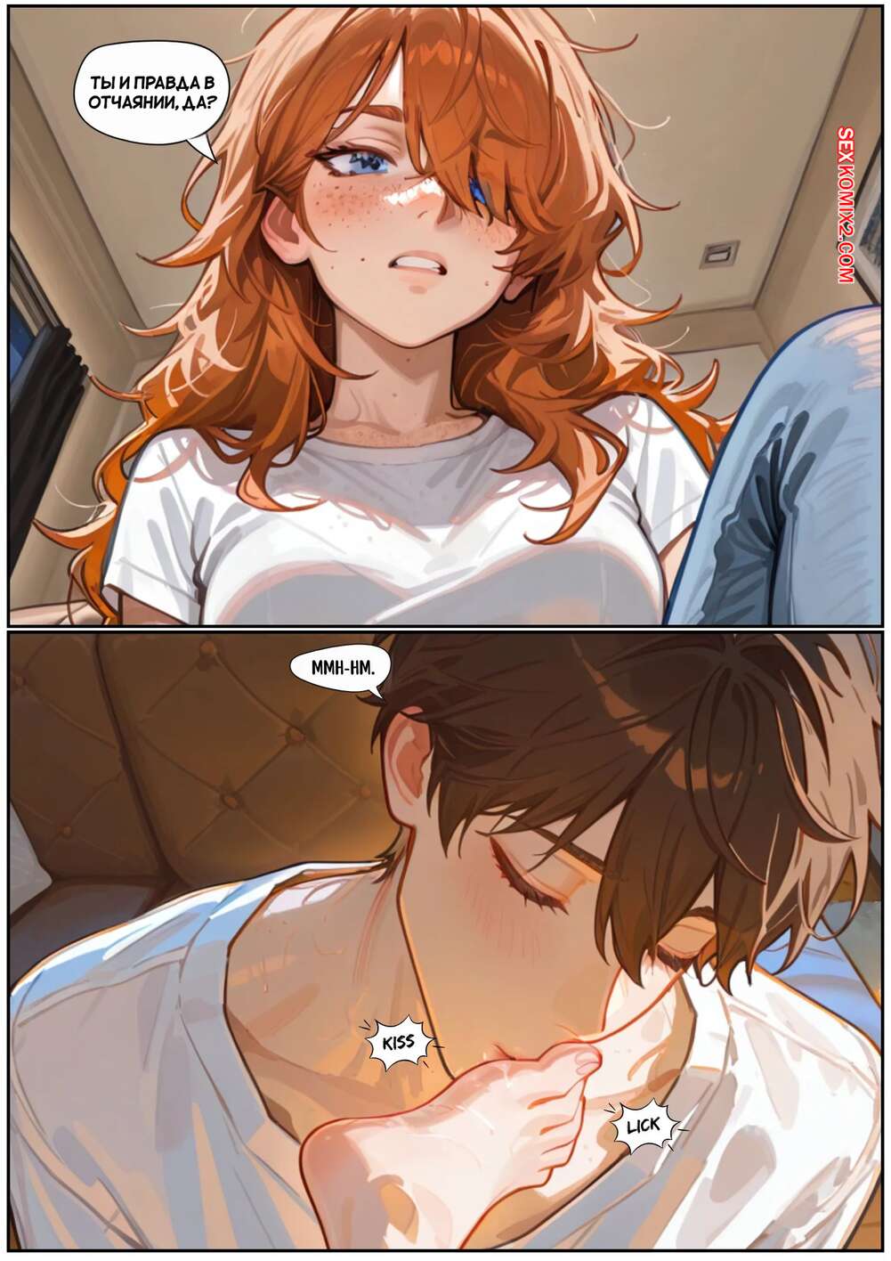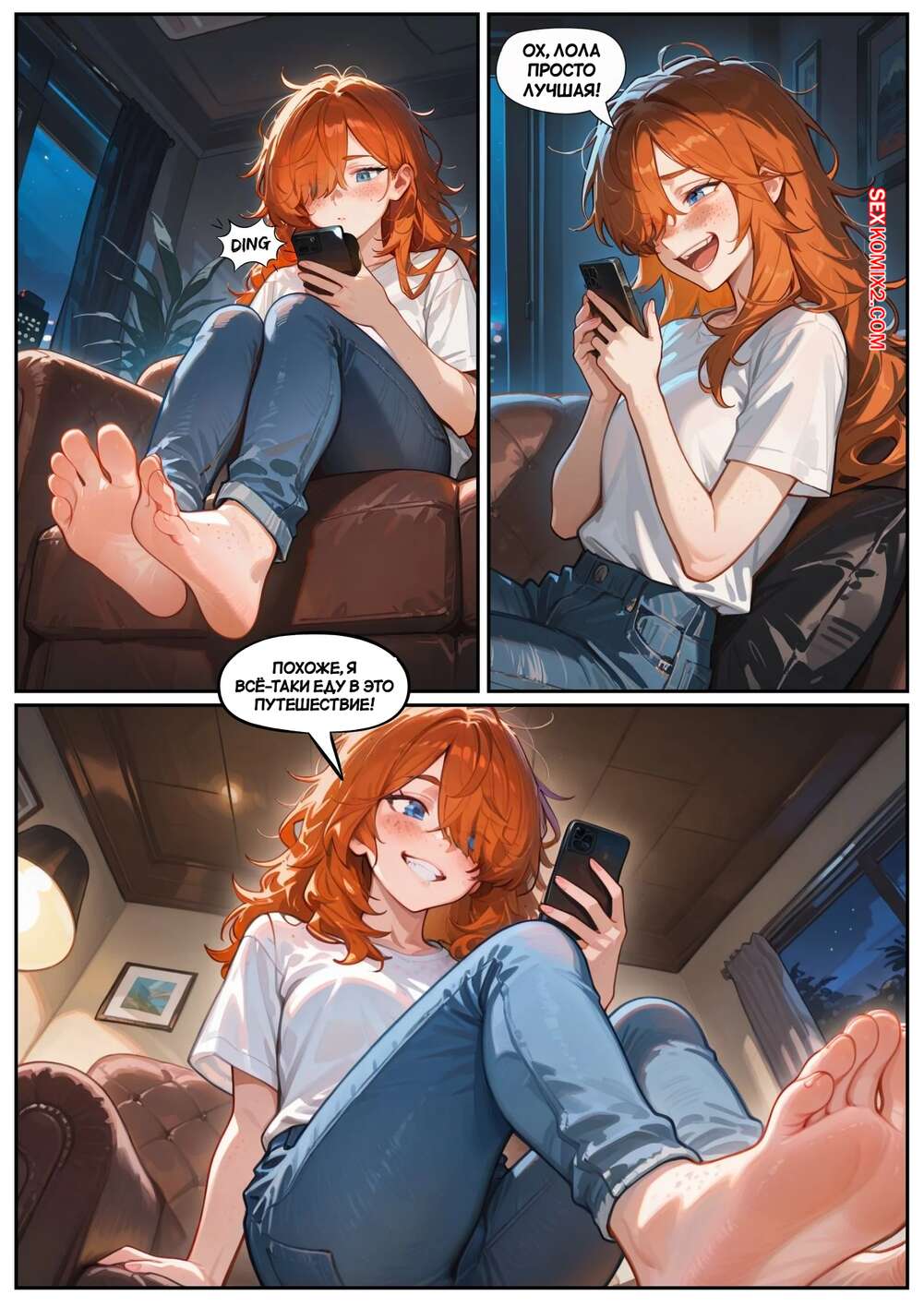 Порно комикс Скарлет Блейз. Часть 3. Не замечая ее Парень с девушкой выпивали вино, после чего рыжуля решила пошалить. Она стала массировать ножками член парня, после чего сняла трусики и дала ему попробовать на вкус свои дырочки.