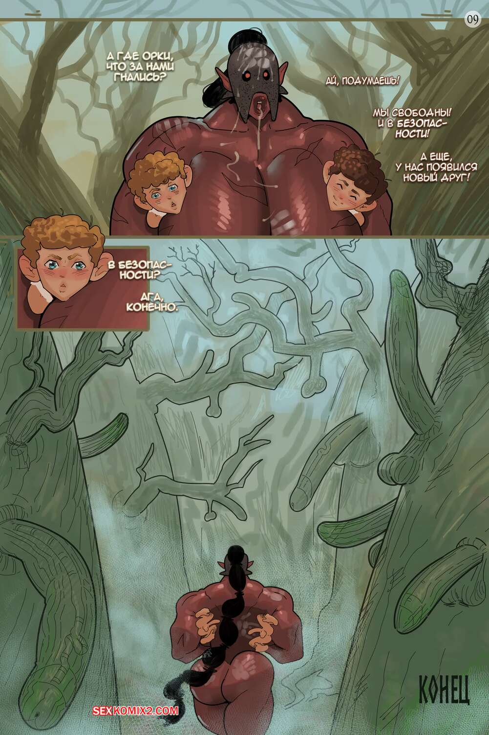 Порно комикс The Lord of the Rings. Новый друг Мерри и Пиппина. Meinfischer На юных парней нападает огромная мускулистая брюнетка, но парни знают что с ней делать. Они объединяются в команду и как следует трахают девушку, завоевывая ее расположение.