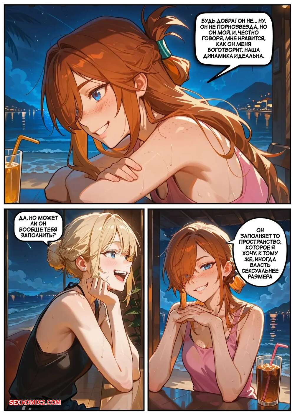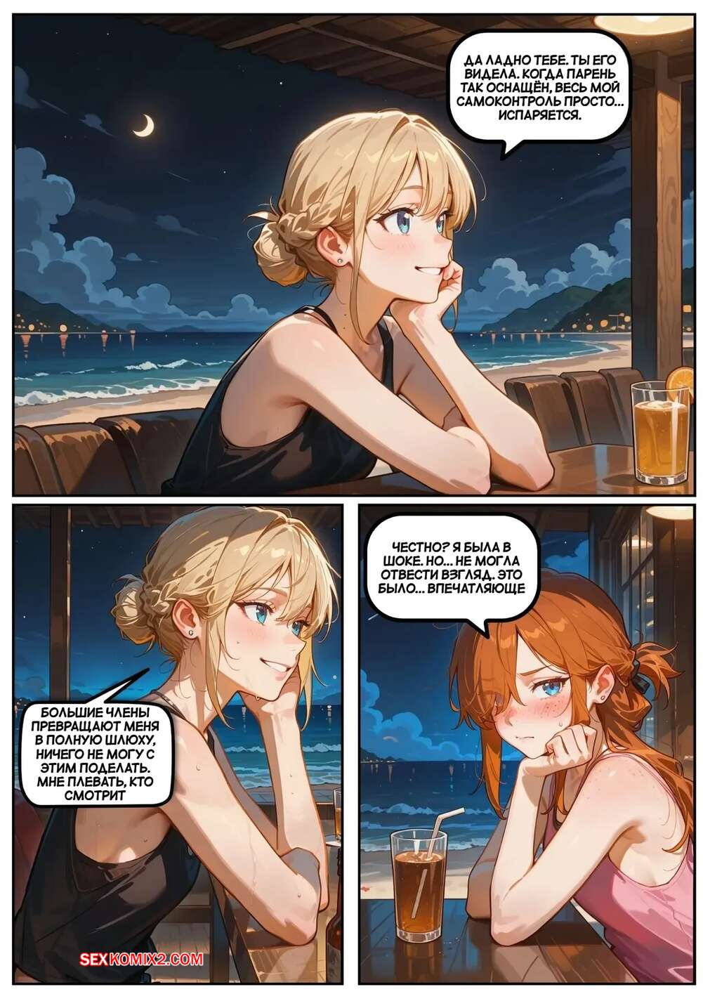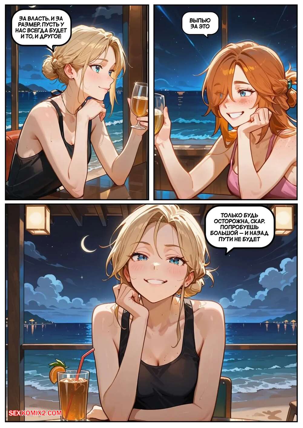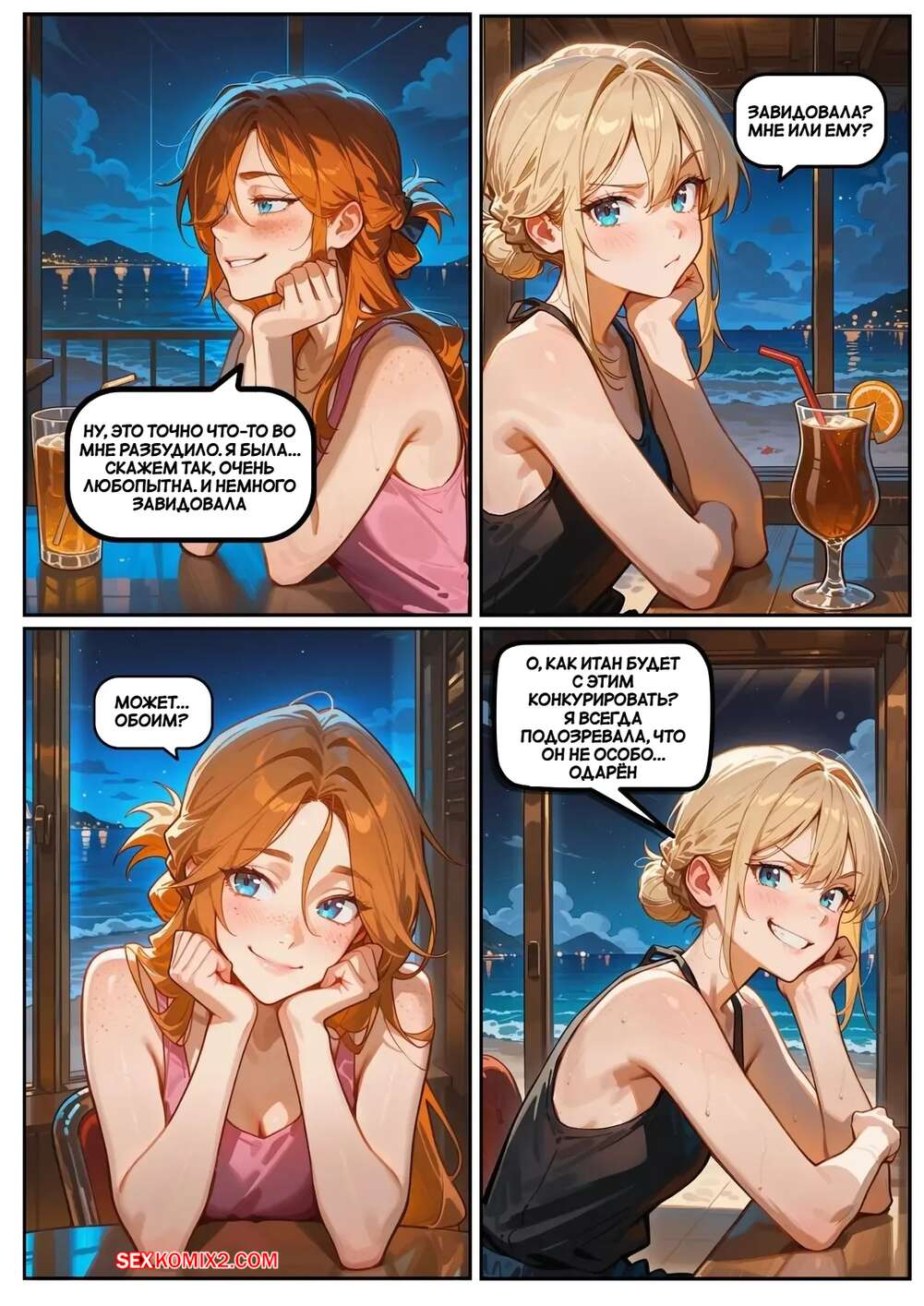 Порно комикс Скарлет Блейз. Часть 5. Вознаграждение за сдержанность Две подруги отдыхали вечером в кафе и выпивали вино. Блондиночка продолжила вечер со своим темнокожим дружком, который ее как следует выебал, а рыжуля переписывалась с дружком, лаская свою пизденку пальчиками.