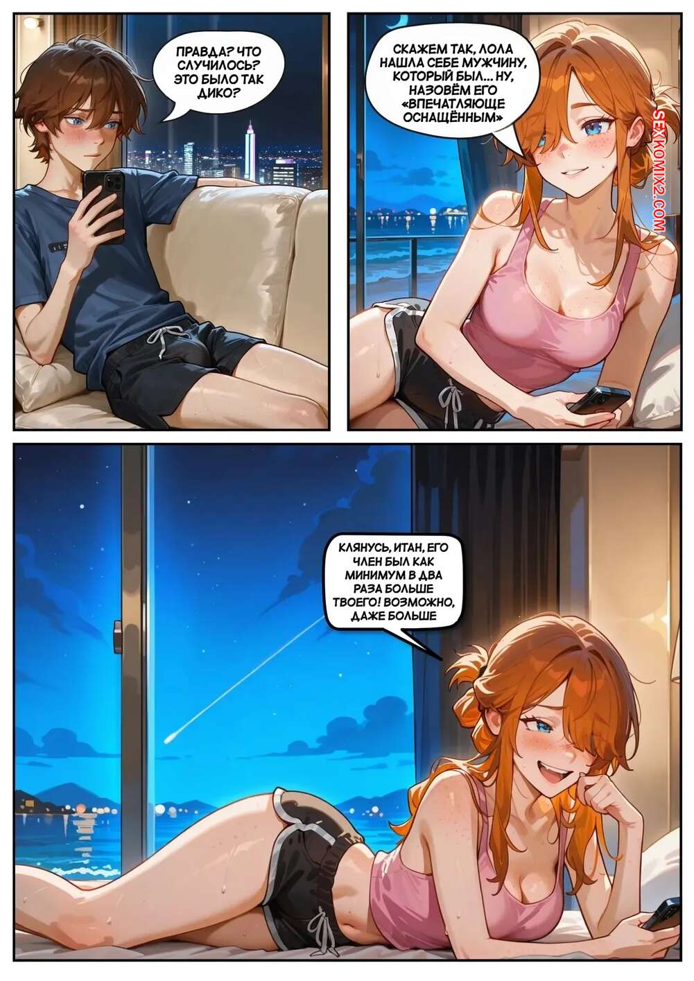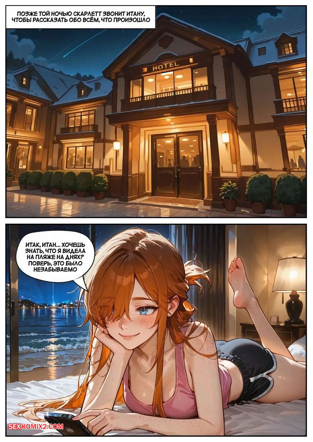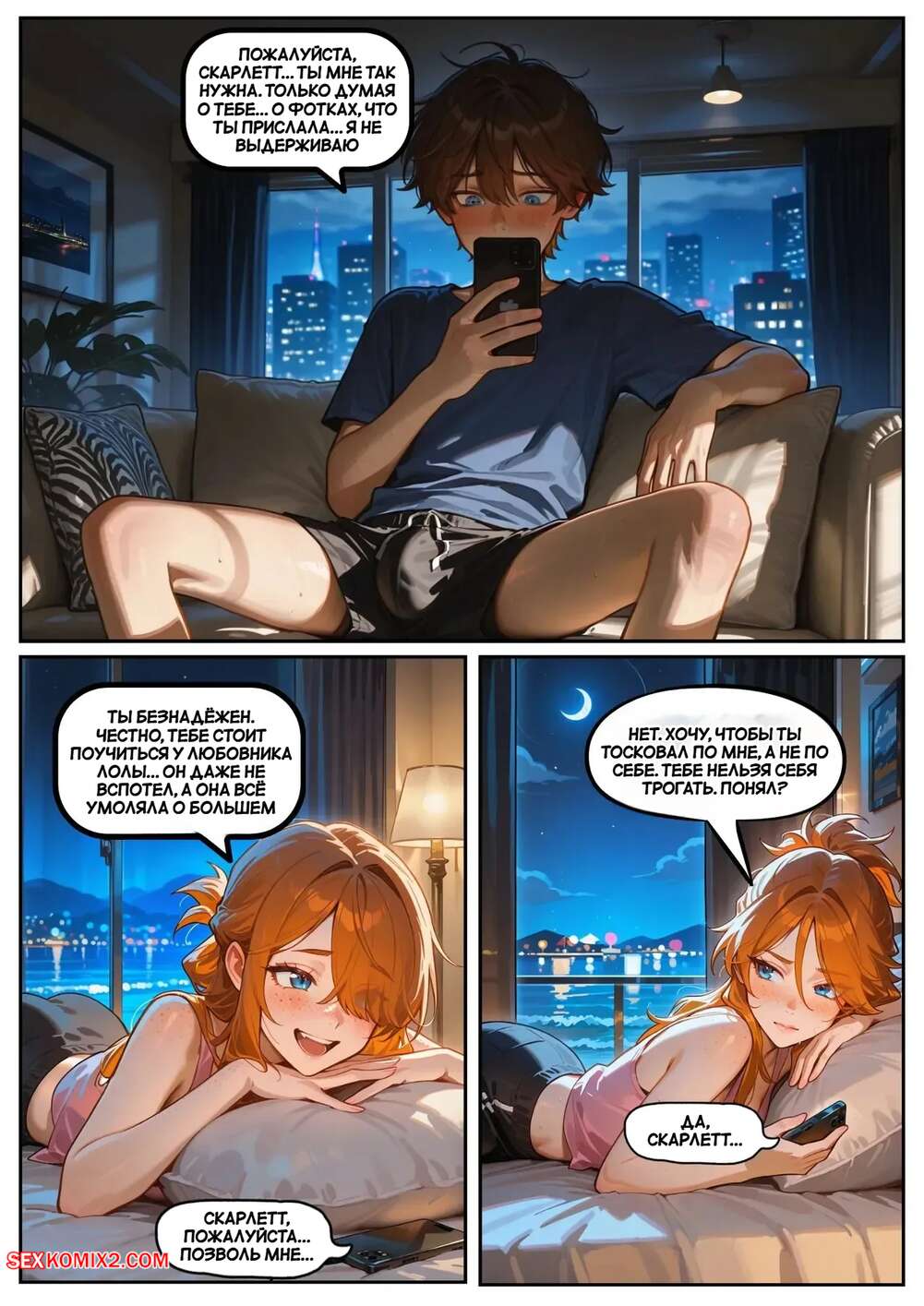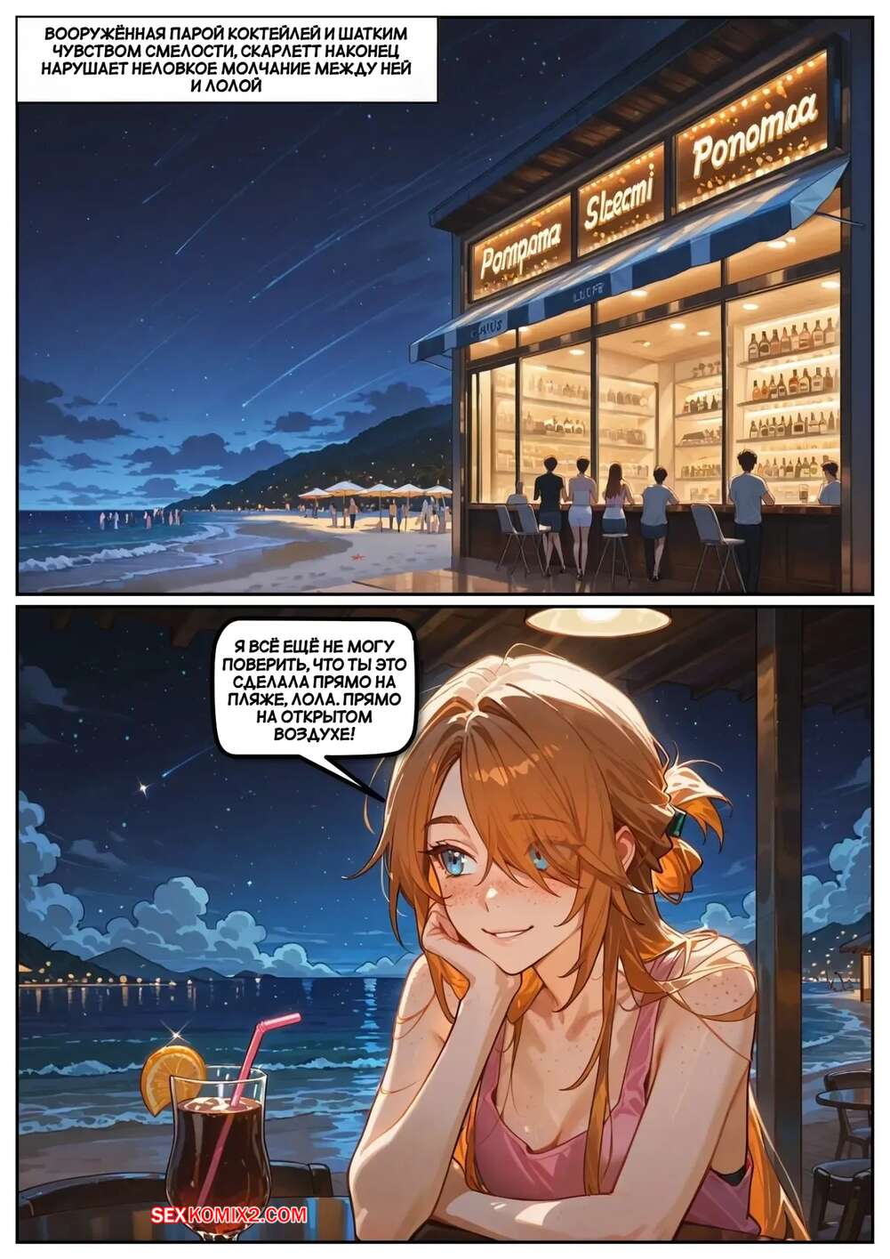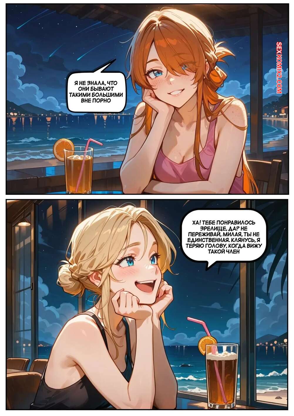 Порно комикс Скарлет Блейз. Часть 5. Вознаграждение за сдержанность Две подруги отдыхали вечером в кафе и выпивали вино. Блондиночка продолжила вечер со своим темнокожим дружком, который ее как следует выебал, а рыжуля переписывалась с дружком, лаская свою пизденку пальчиками.