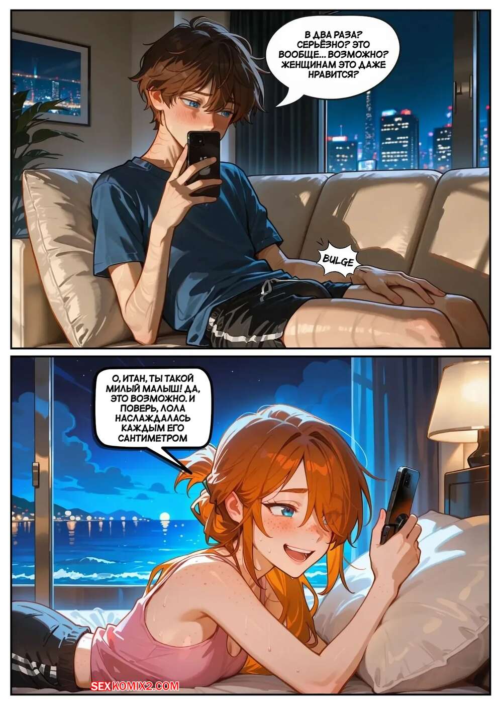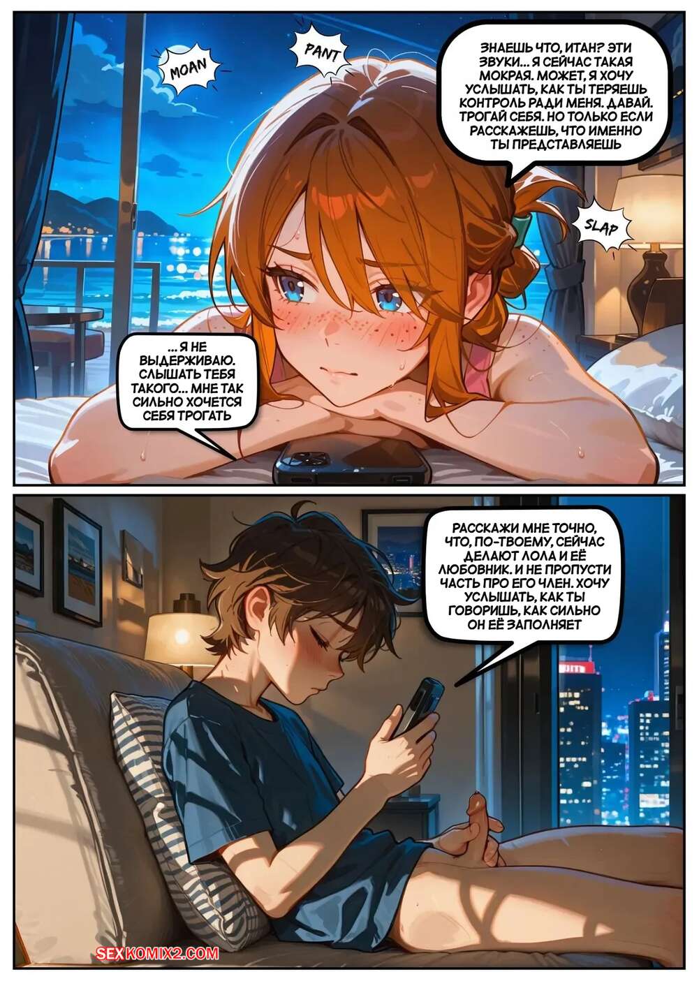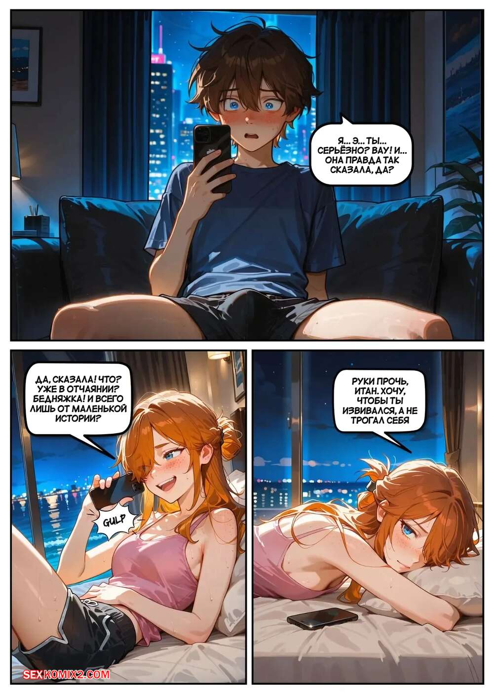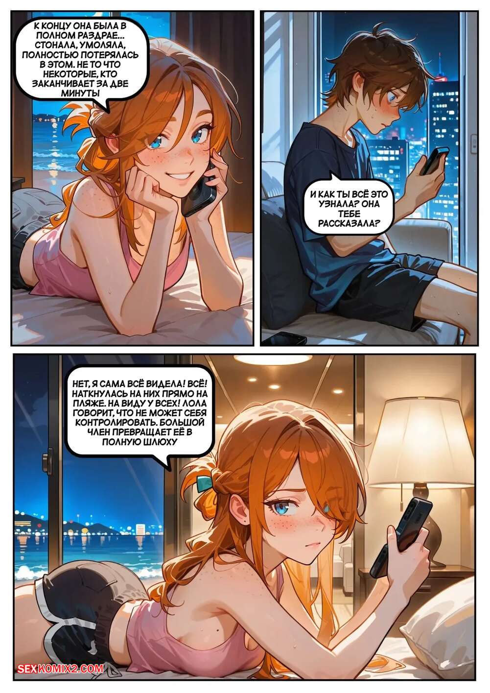 Порно комикс Скарлет Блейз. Часть 5. Вознаграждение за сдержанность Две подруги отдыхали вечером в кафе и выпивали вино. Блондиночка продолжила вечер со своим темнокожим дружком, который ее как следует выебал, а рыжуля переписывалась с дружком, лаская свою пизденку пальчиками.