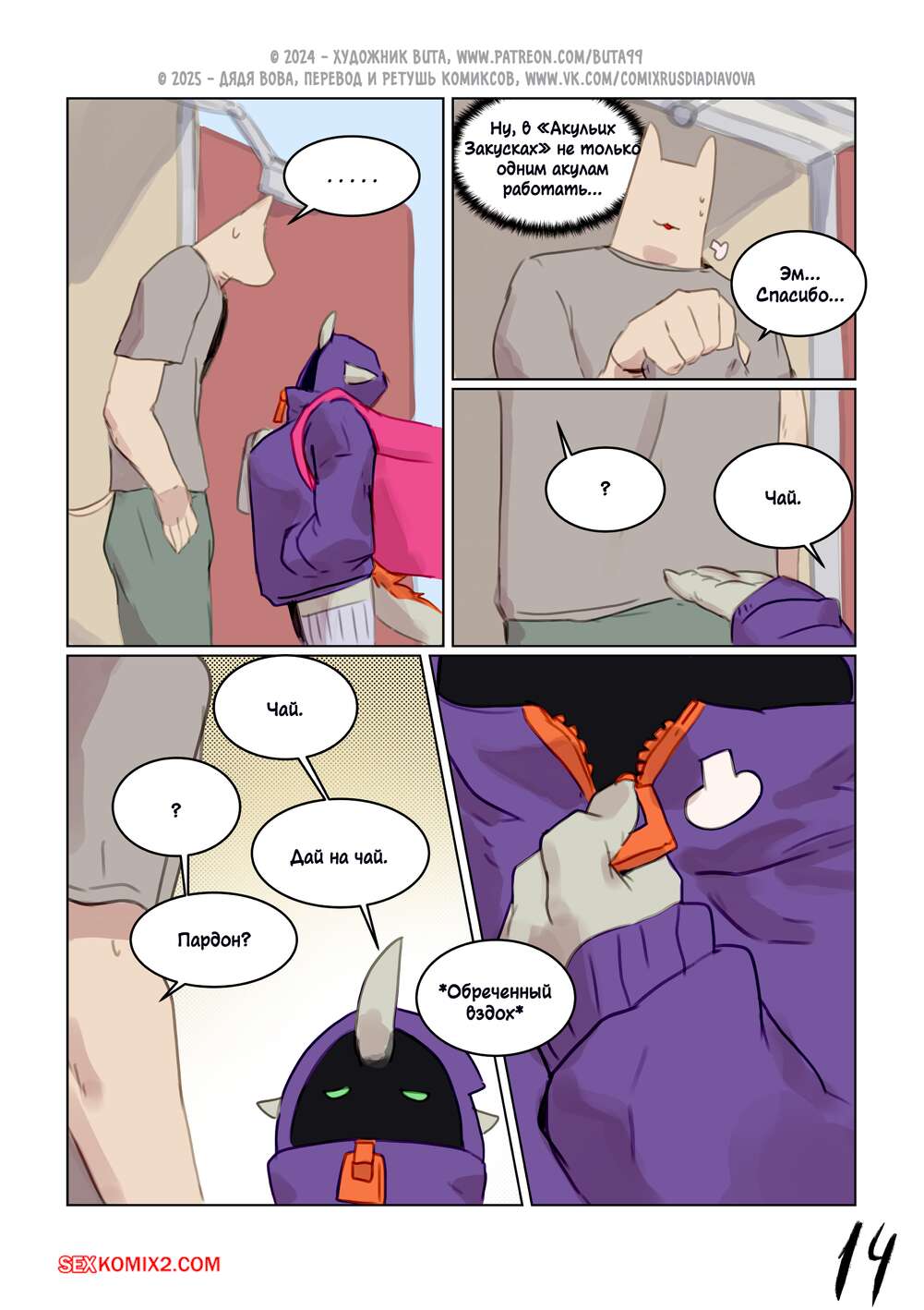 Порно комикс Shark Eats. Акульи Закуски. Часть 2. Новобранцы. Buta99. Секси фурри акула, работает в доставке пиццы, но она так не аккуратна, что постоянно роняет пиццу. В этот раз уронила пиццу перед клиентом и теперь должна отработать свою провинность. Она сделала минет клиенту.
