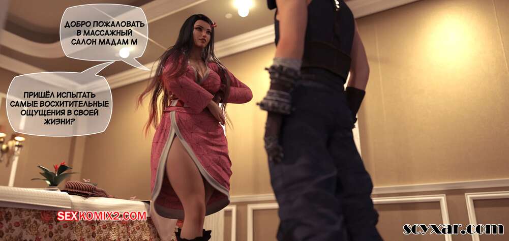 Порно комикс Final Fantasy. Тифа неторарэ. Часть 1. Tifa NTR. Scyxar Studios. Горячая брюнетка делала массаж парню и возбудилась, увидев его стояк. Красотка взяла член в руку и стала дрочить своему клиенту, помогая ему обильно кончить.