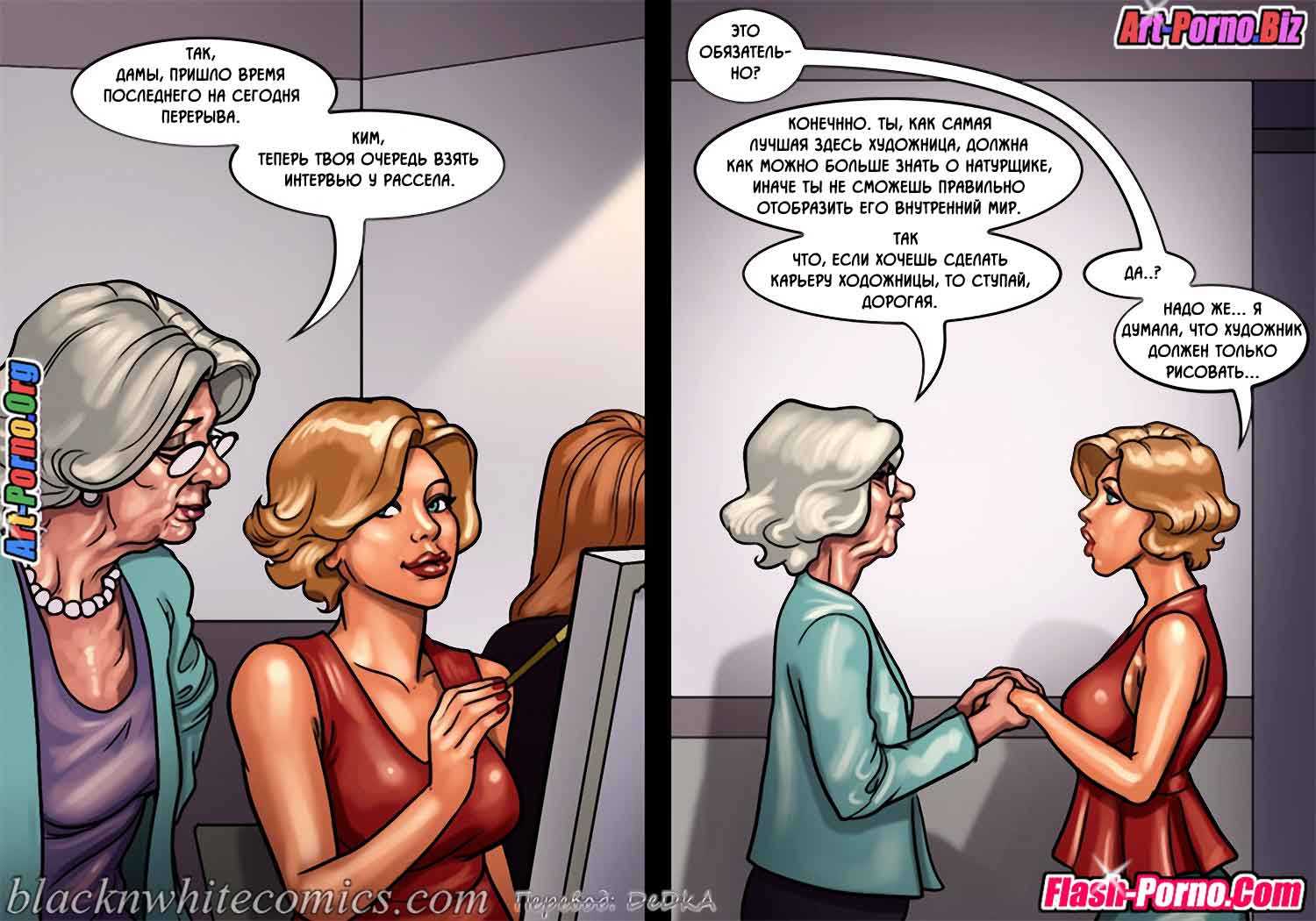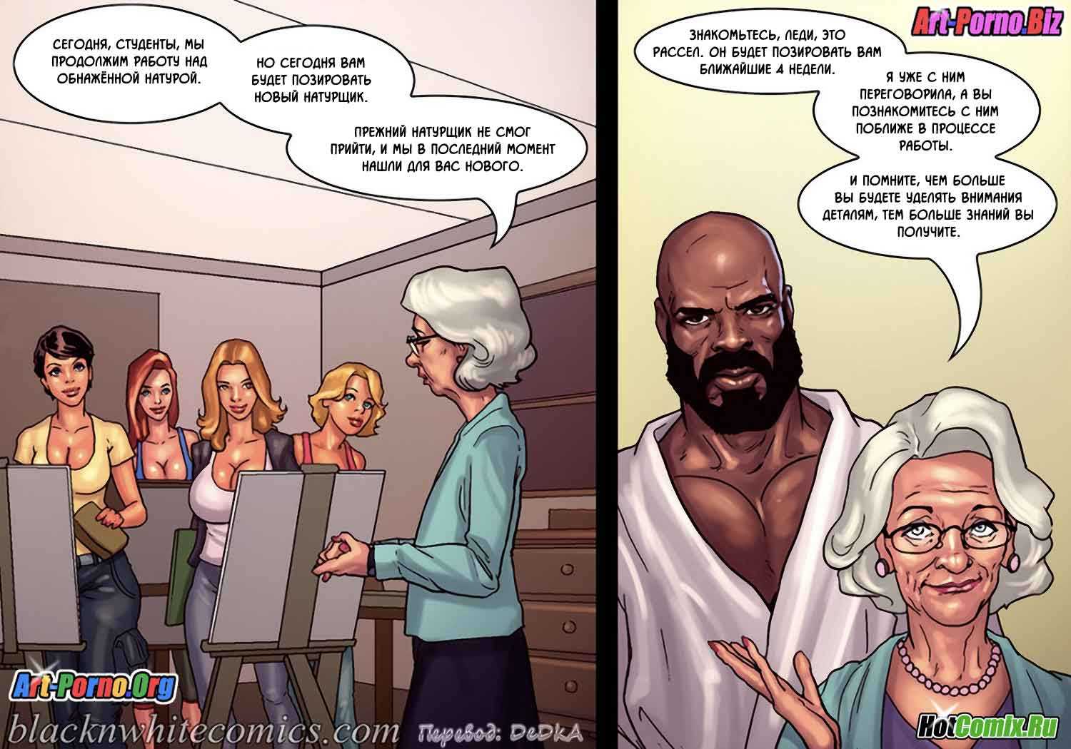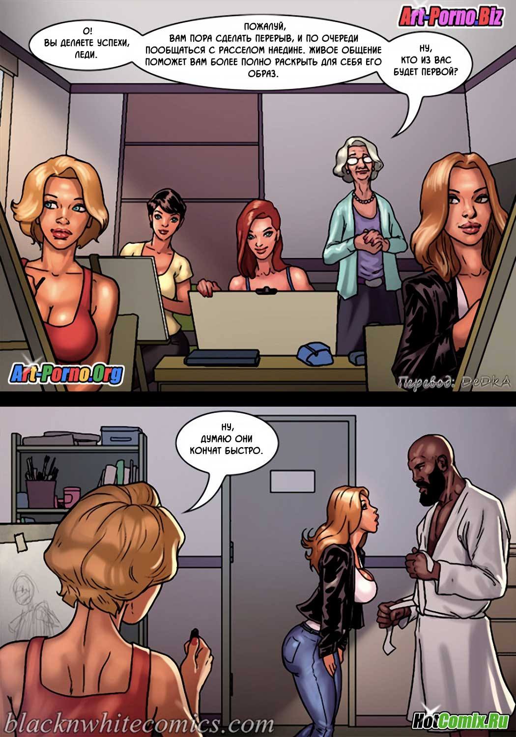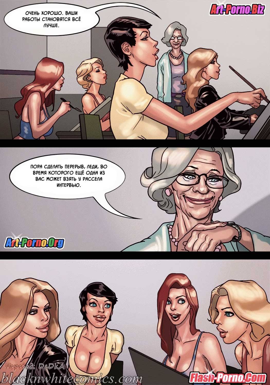 Порно комикс «Художественный кружок». В художественном кружке состоят одинокие девушки, и руководительница этого кружка привела для позирования накаченного мужчину с рельефным телом. Когда он разделся, девушки были приятно шокированы не только от его кубиков на прессе, но и от огромного члена свисающего у него между ног. Вовремя рисования они так сильно возбудились, что начали таскать его по очереди в туалет и трахаться с ним. Даже пожилая руководительница не упустила свой шанс и отсосала ему.