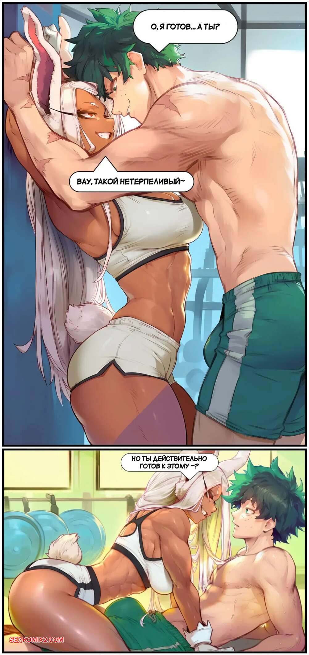 Порно комикс Академия. Деку и Мирко. Deku x Miruko. AKSN. Мирко и Деку тренировались в спортзале и блондиночка предложила парню повеселиться. Она встала на колени и отсосала хуй друга, после чего дала ему выебать свою пизденку и кончить в нее.