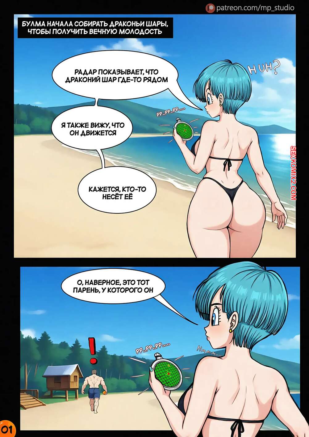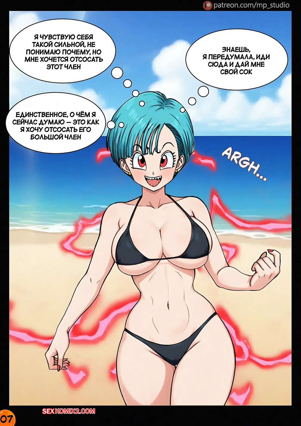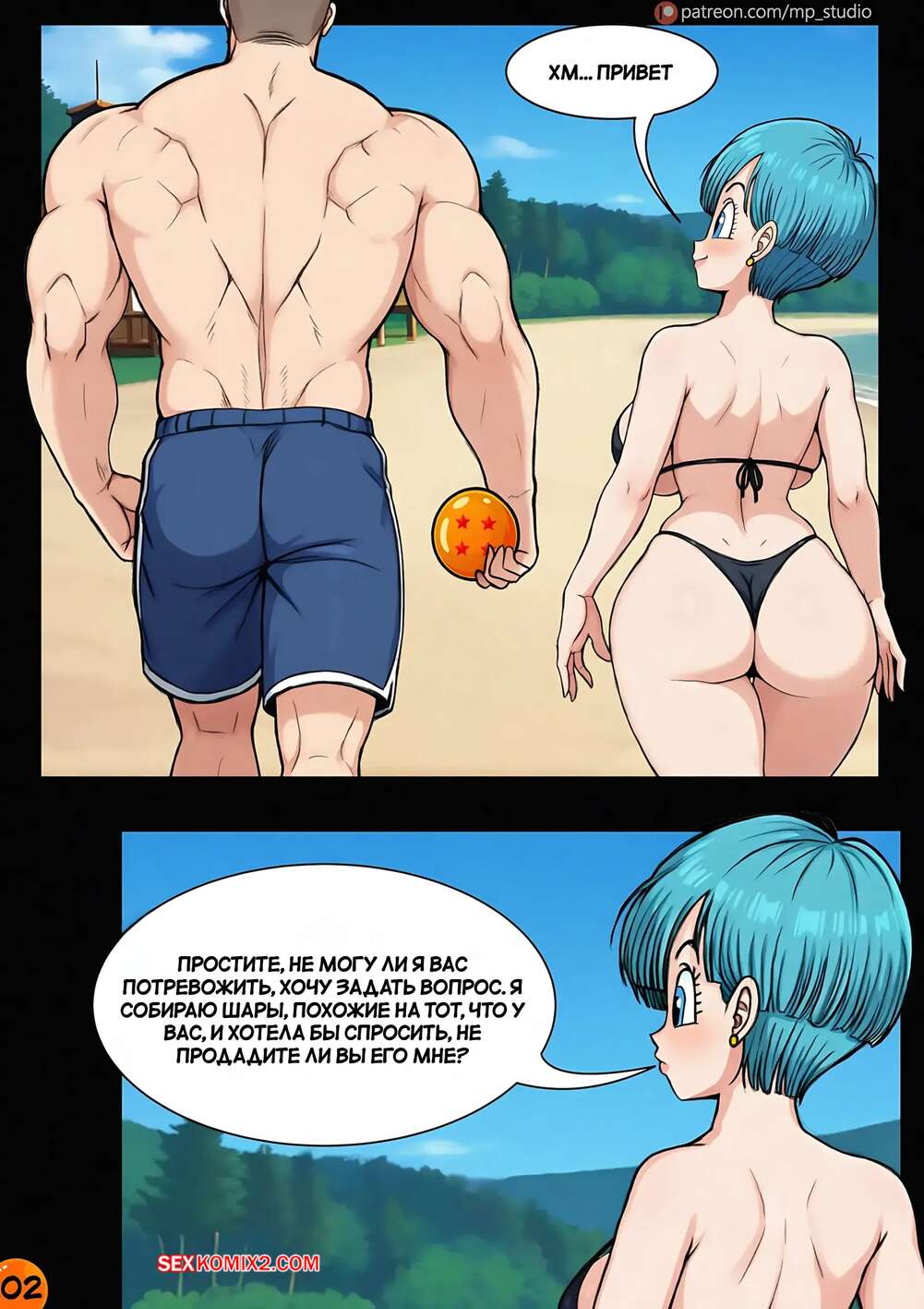Порно комикс Dragon Ball. Маджин Бульма. Majin Bulma. MP studio. Красотка Бульма пришла на пляж, где парень быстро привлек ее внимание своим большим хуем. Возбужденная девушка встала на колени и стала сосать хуй парня, доставив ему невероятный оргазм.