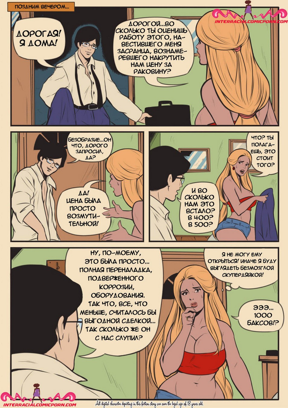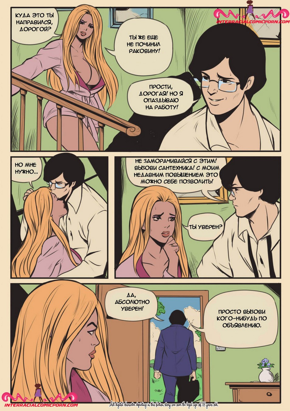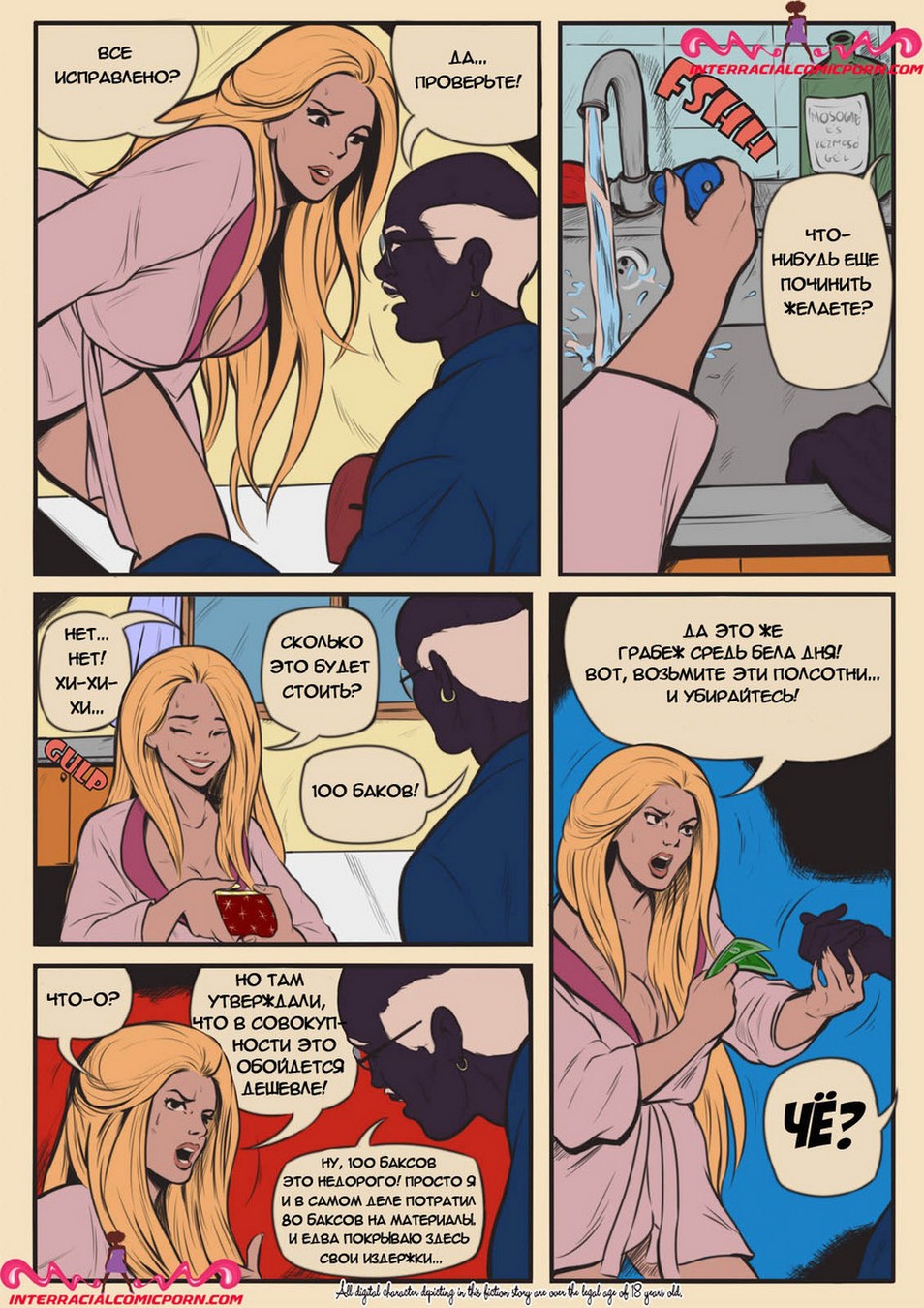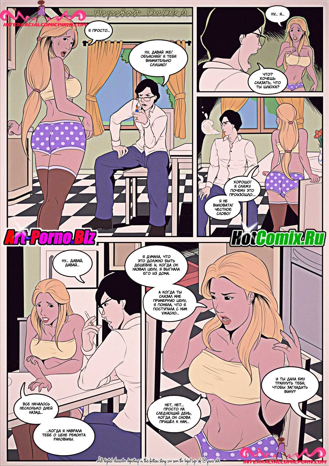 Развратные комиксы «Сантехник». Ранним утром Молодая жена пыталась соблазнить своего мужа, чтобы заняться с ним сексом, но он очень сильно был озадачен работой и отказался. Когда он ушёл на работу она обнаружила, что у них дома сломана раковина и вызвала сантехника. Чуть позже пришел чернокожий мужчина и начал ремонтировать раковину, девушка была так сильно возбуждена, что от вида того что происходило у неё на кухне она потекла. И решила соблазнить сантехника, заманив его к себе в кровать занялась жестким сексом.