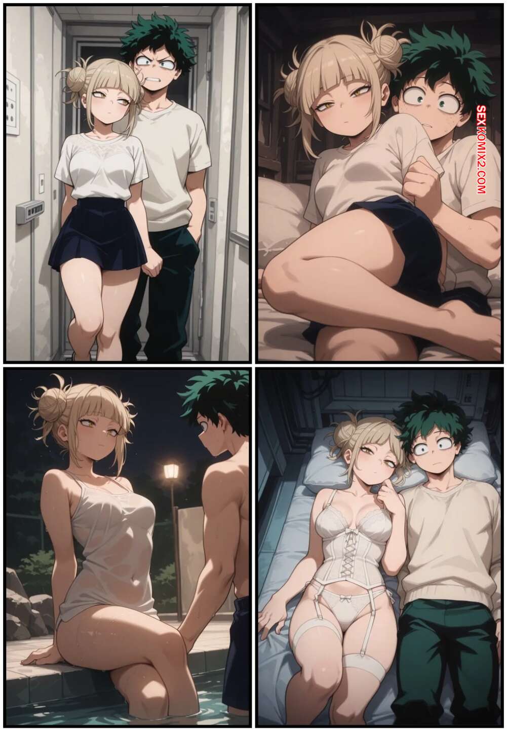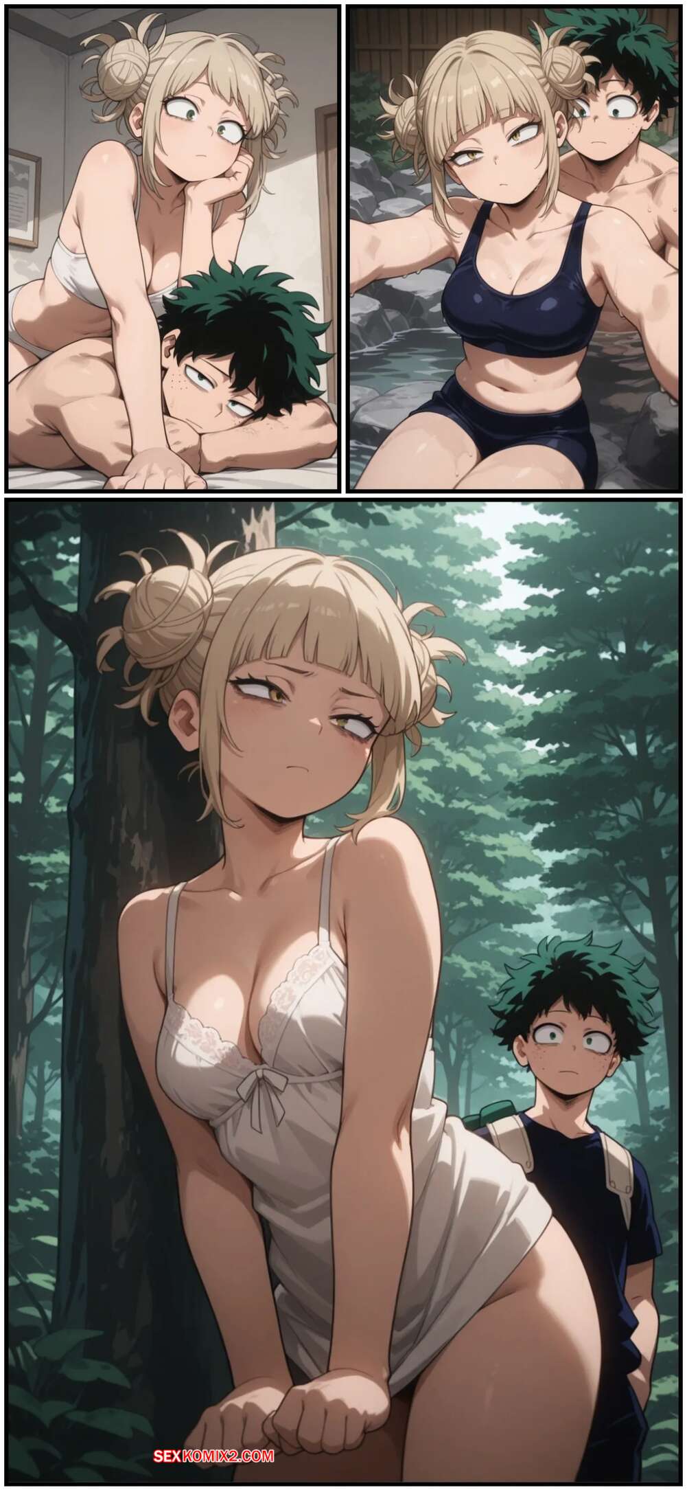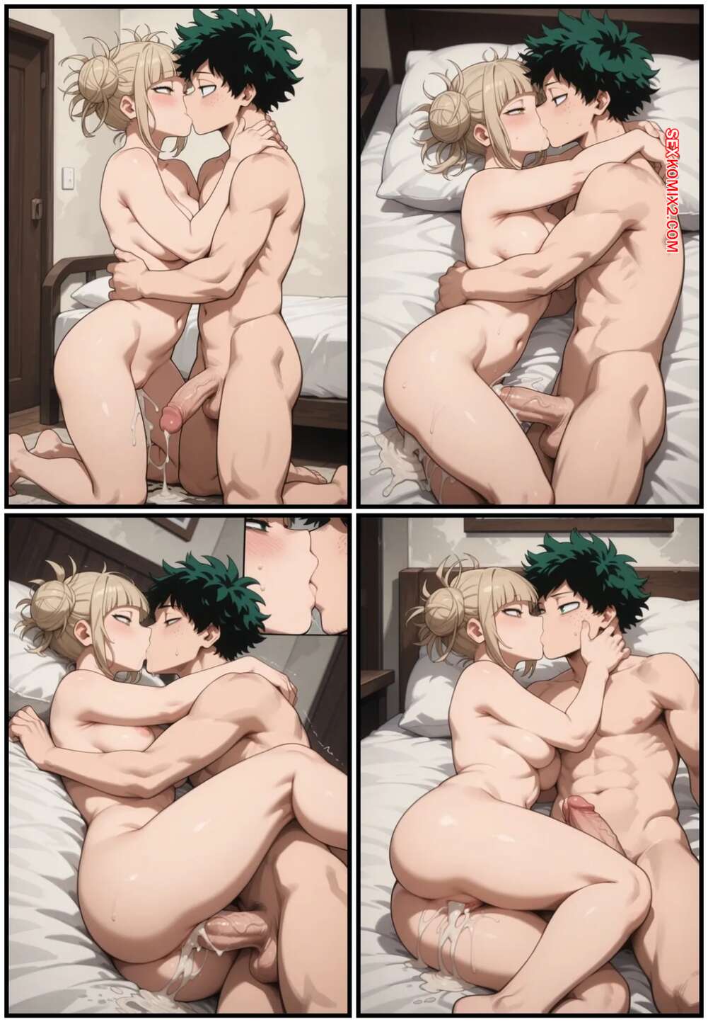 Порно комикс Академия. Опасное искушение Тога и Деку. Dangerous Temptation. Miau Escarlate. Блондиночка Тога разделась перед Деку и возбудила его своими аппетитными прелестями. Красотка спустилась на колени и отсосала хуец парня, после чего раздвинула ножки и дала ему выебать свою пизденку.