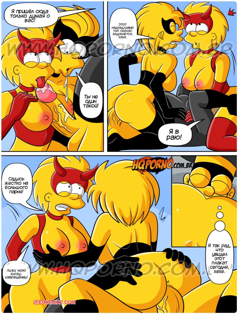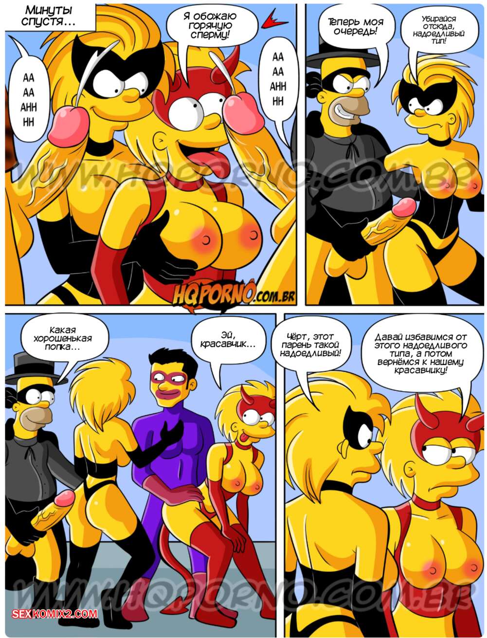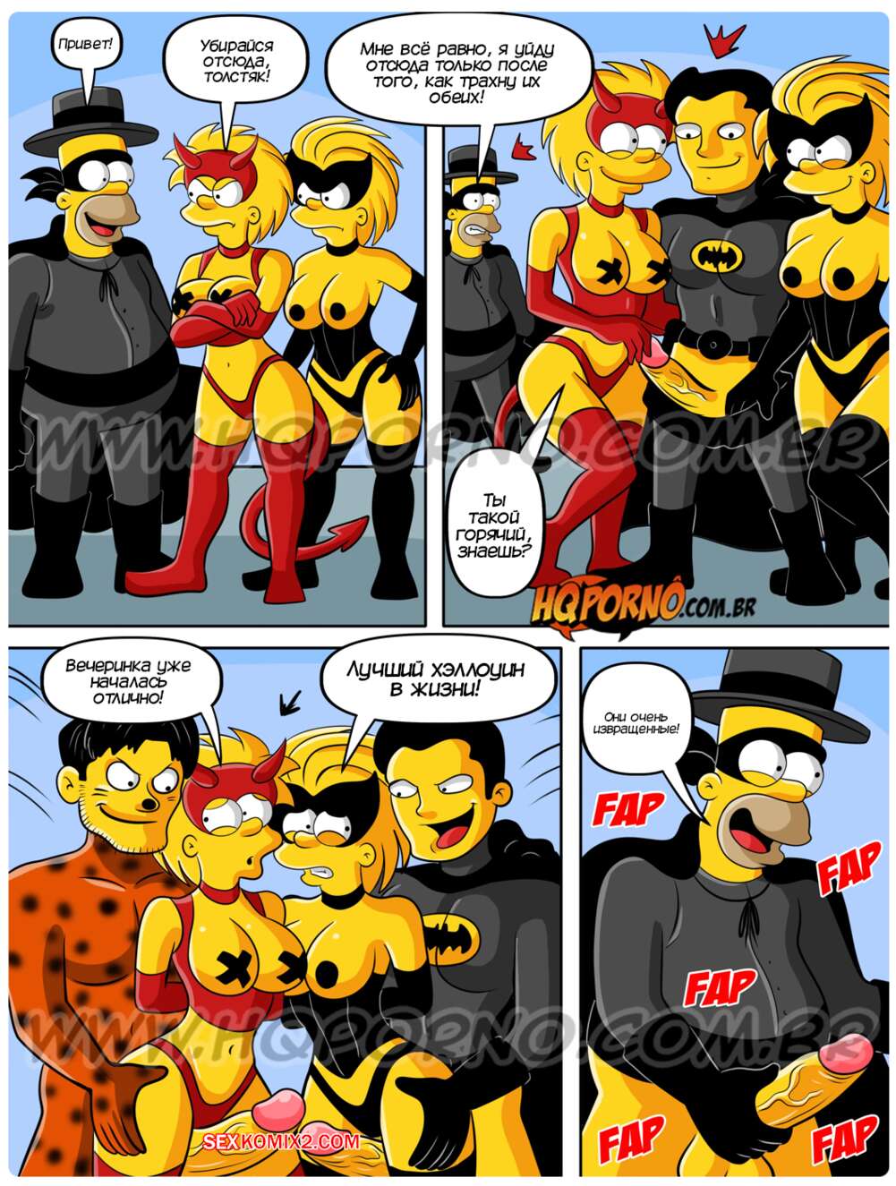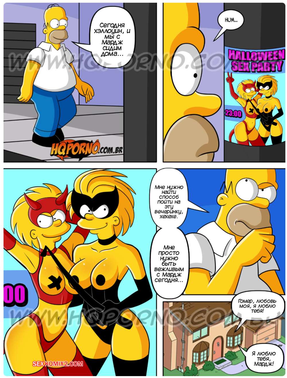Порно комикс Симпсексы. Часть 24. Os Simpsexys. HQPorno Гомер увидел плакат о вечеринке в честь Хэллоуина и решил отправиться туда, увидев двух горячих красоток. Прийдя на тусовку, он добился встречи с девушками, желая их отъебать.