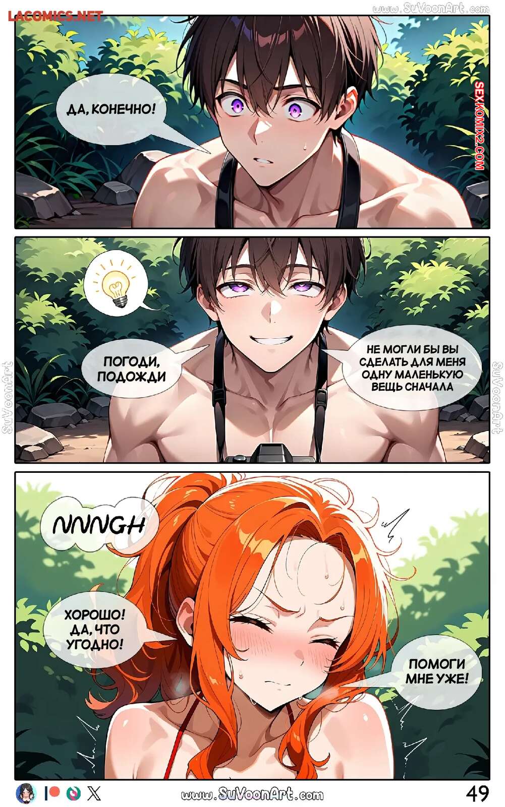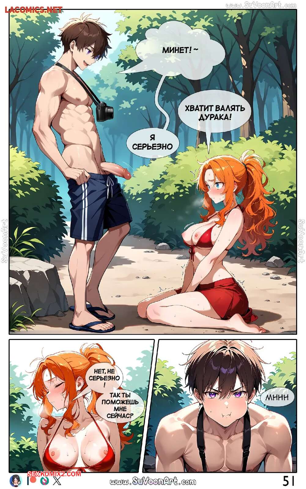 Порно комикс Другая сторона. Часть 3. The Other Side. SuVoonArt Парень решил помочь рыжей красотке с ее похотью. Он достал член и дал девушке у себя отсосать, после чего уложил ее на землю и хорошенько выебал ее пизденку.